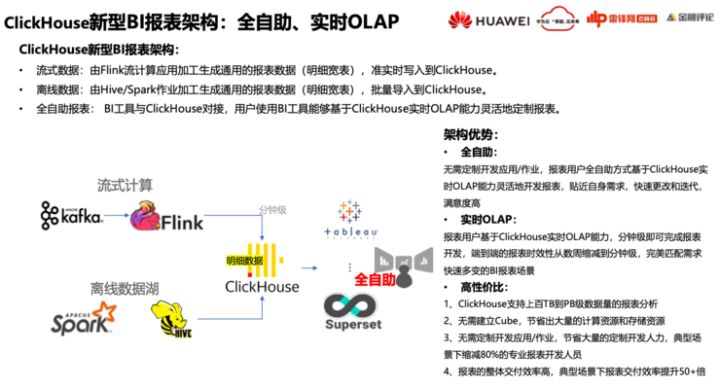 现在可以将所有明细数据以大宽表的形式加载Clickhouse,BI用户可以基于Clickhouse大宽表进行自助分析,对数据工程师供数要求就会少很多,甚至大部分情况下的新需求都不需要重新供数,开发效率和BI报表上线率都会得到极大提升。