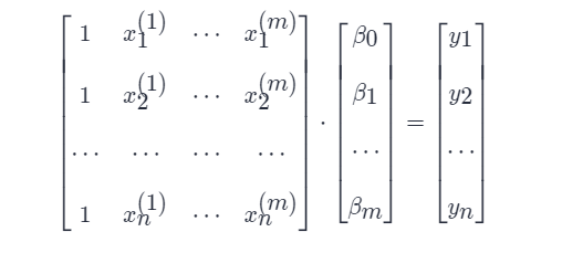 如果将样本矩阵x_i^hxih记为矩阵A,将参数矩阵记为向量\betaβ,真实值记为向量Y,上述线性方程组可以表示为: