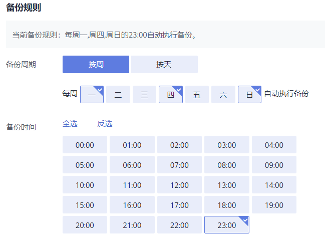 备份周期:设置在哪天备份,可以每周的每天备份,也可以隔天备份。这里可以看到小编的备份规则设置为每周一、周四、周日的晚上11点备份一次,那么一周就会产生3个备份。