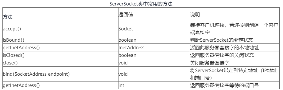 - ServerSocket(inr port):创建绑定到特定端口的服务器套接字