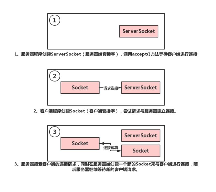 值得注意的是:服务器套接字一次只能与一个客户端套接字进行连接,因此如果存在多台客户端同时发送连接请求,则服务器套接字就会将请求的客户端存放到队列中去,然后从中取出一个套接字与服务器建立的套接字进行连接,但是服务器端能够容纳的客户端套接字也不是无限的,当请求连接的数量大于最大容纳量时,那么多出来的请求就会被拒接,一般来说队列的默认大小是50。