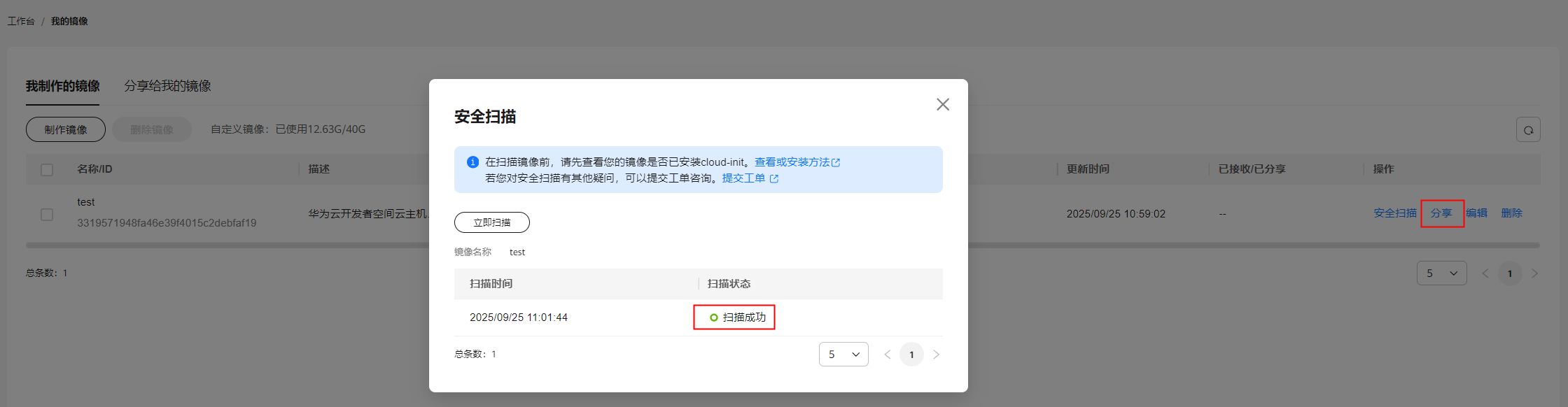 此时还不能分享镜像,需要先进行安全扫描。点击操作栏安全扫描,在安全扫描对话框中点击立即扫描。