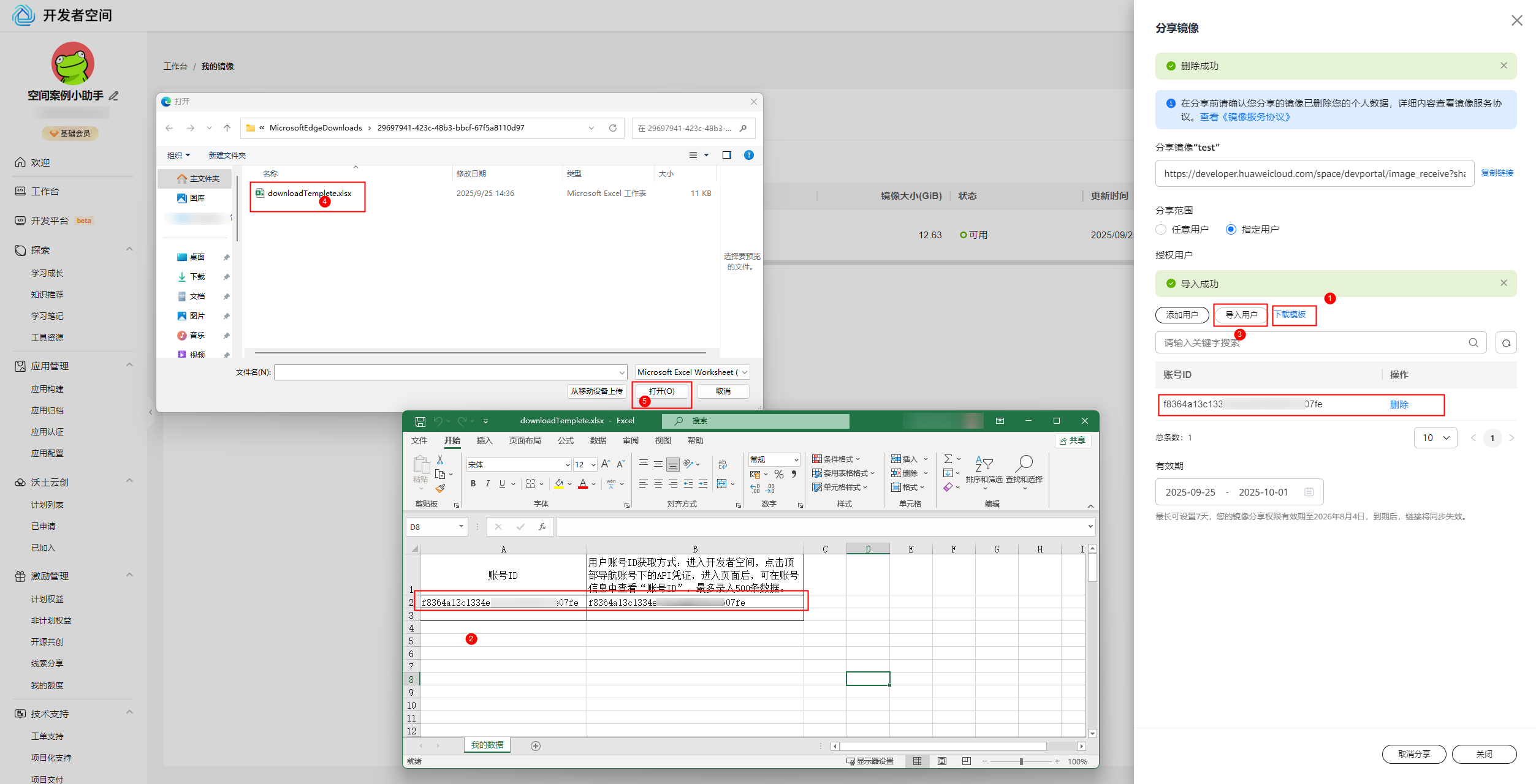 - 点击导入用户,下载模版正确填写用户账号id,点导入用户,打开填写的模板表格。导入成功后,列表页新增数据。