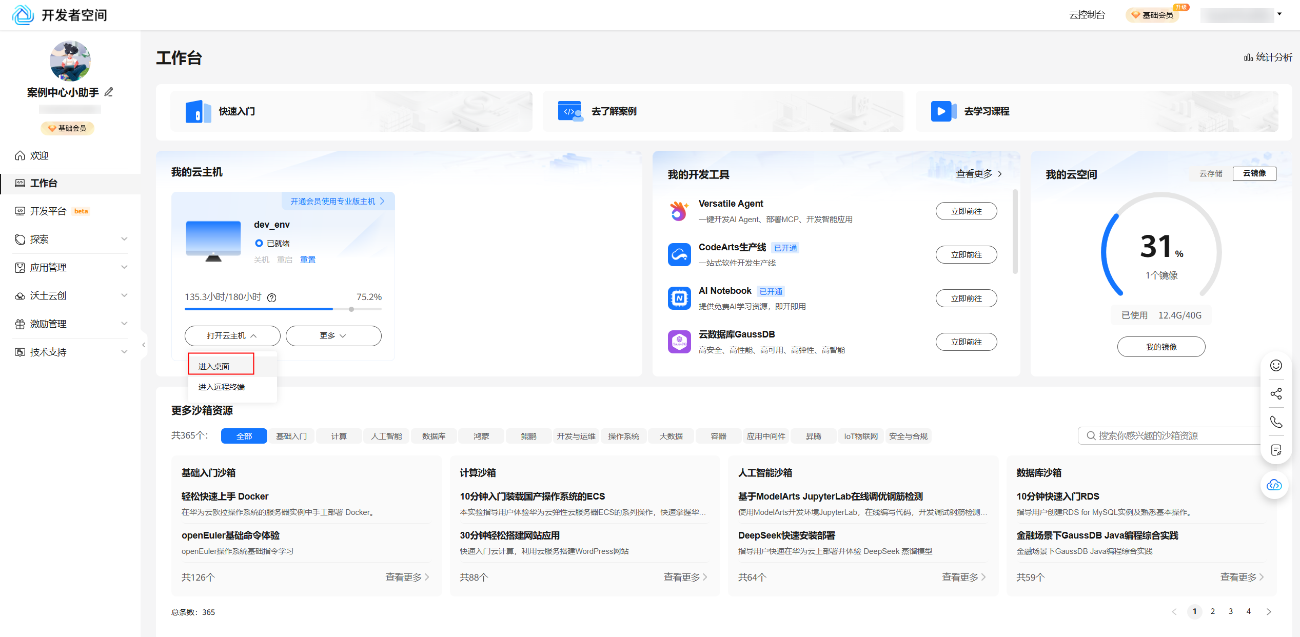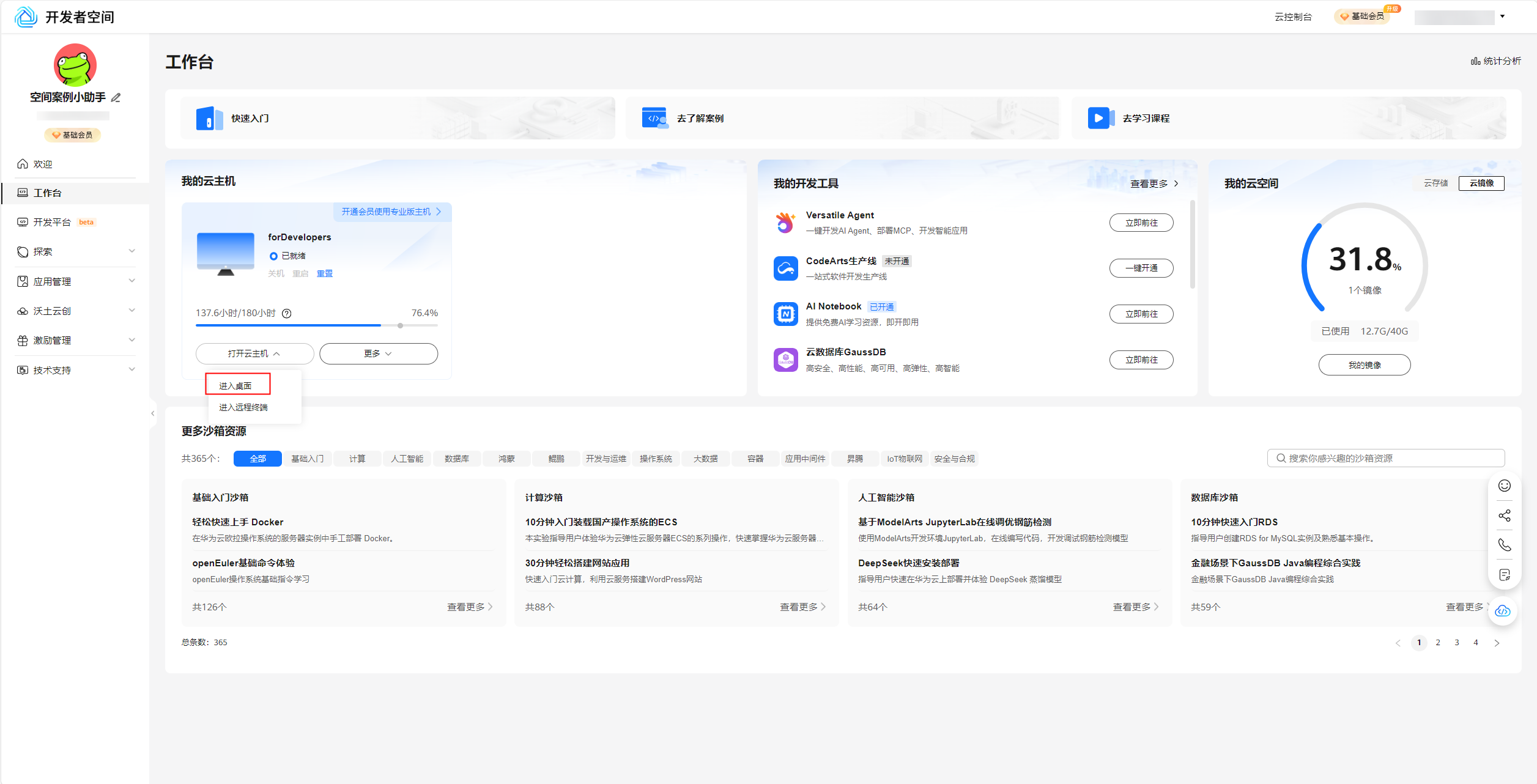 安装完成后,在华为开发者空间工作台界面,点击打开云主机 > 进入桌面连接云主机。