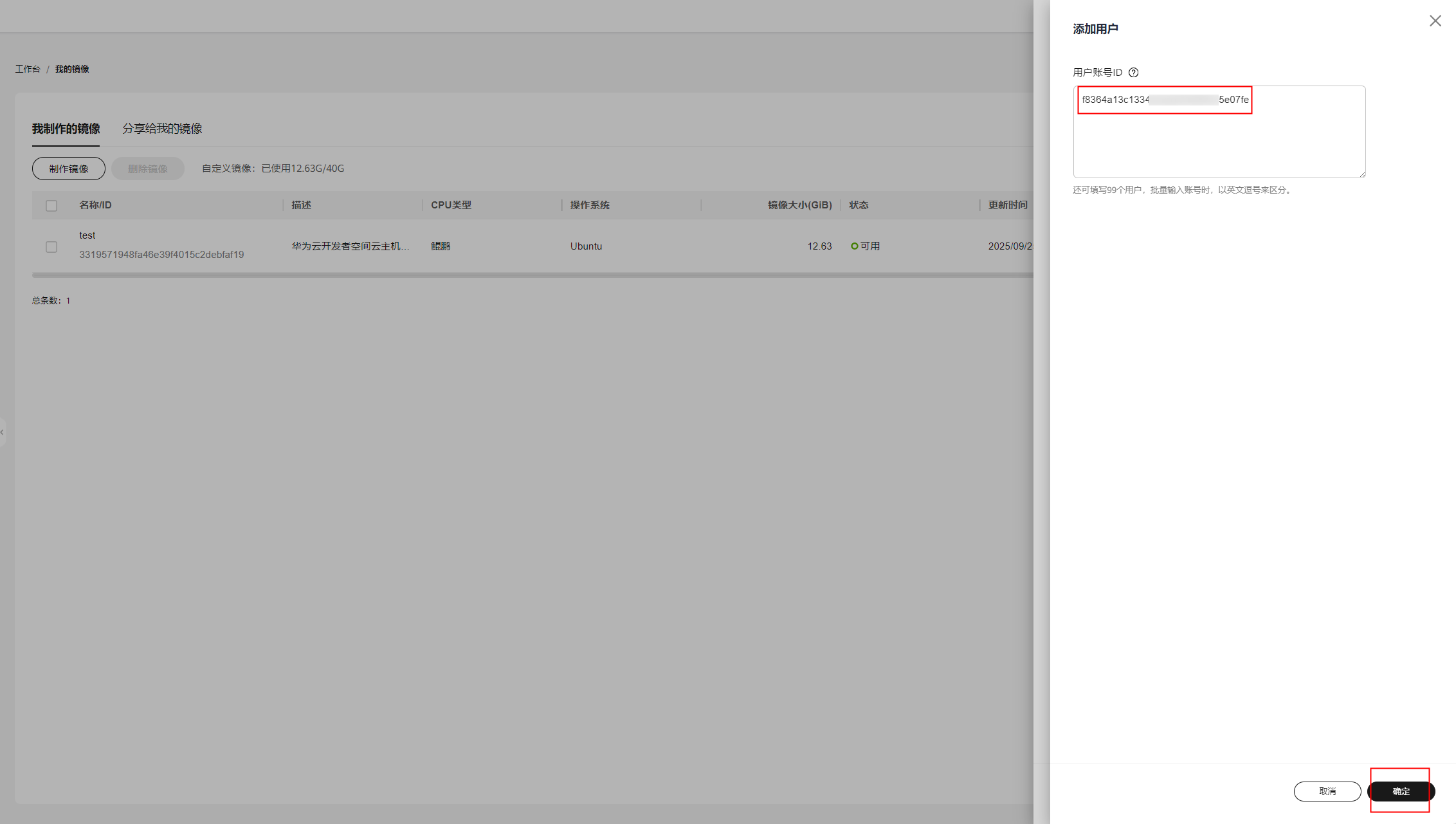 分享镜像功能支持任意用户和指定用户分享。在工作台 > 我的镜像 > 我制作的镜像列表中,找到已经经过安全扫描的镜像,在操作栏点击分享,弹出分享镜像抽屉。