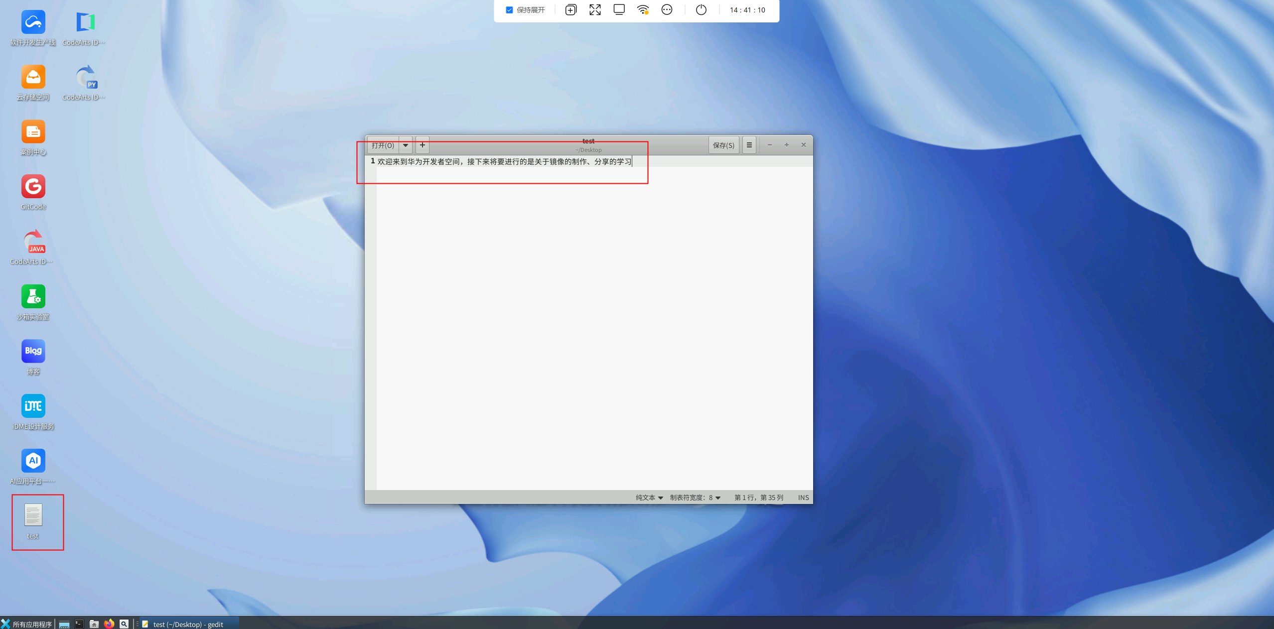 在云主机桌面打开test文件,文件内容为“欢迎来到华为开发者空间,接下来将要进行的是关于镜像的制作、分享的学习”,与“二、环境准备与资源领取”中被制作镜像的云主机写入的文件名与内容一致。