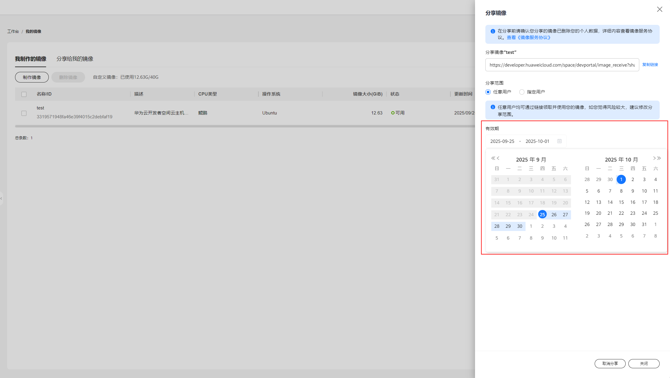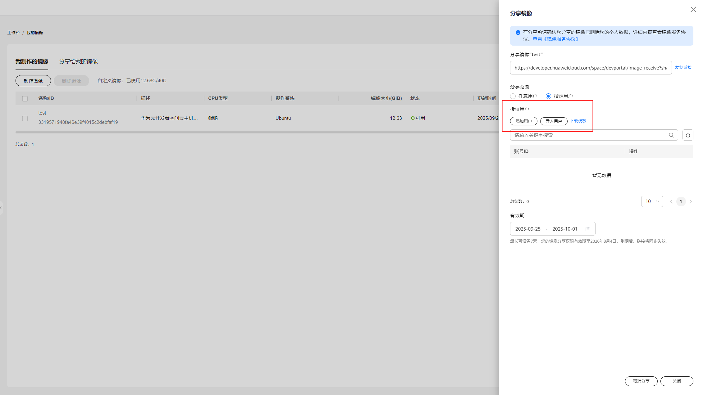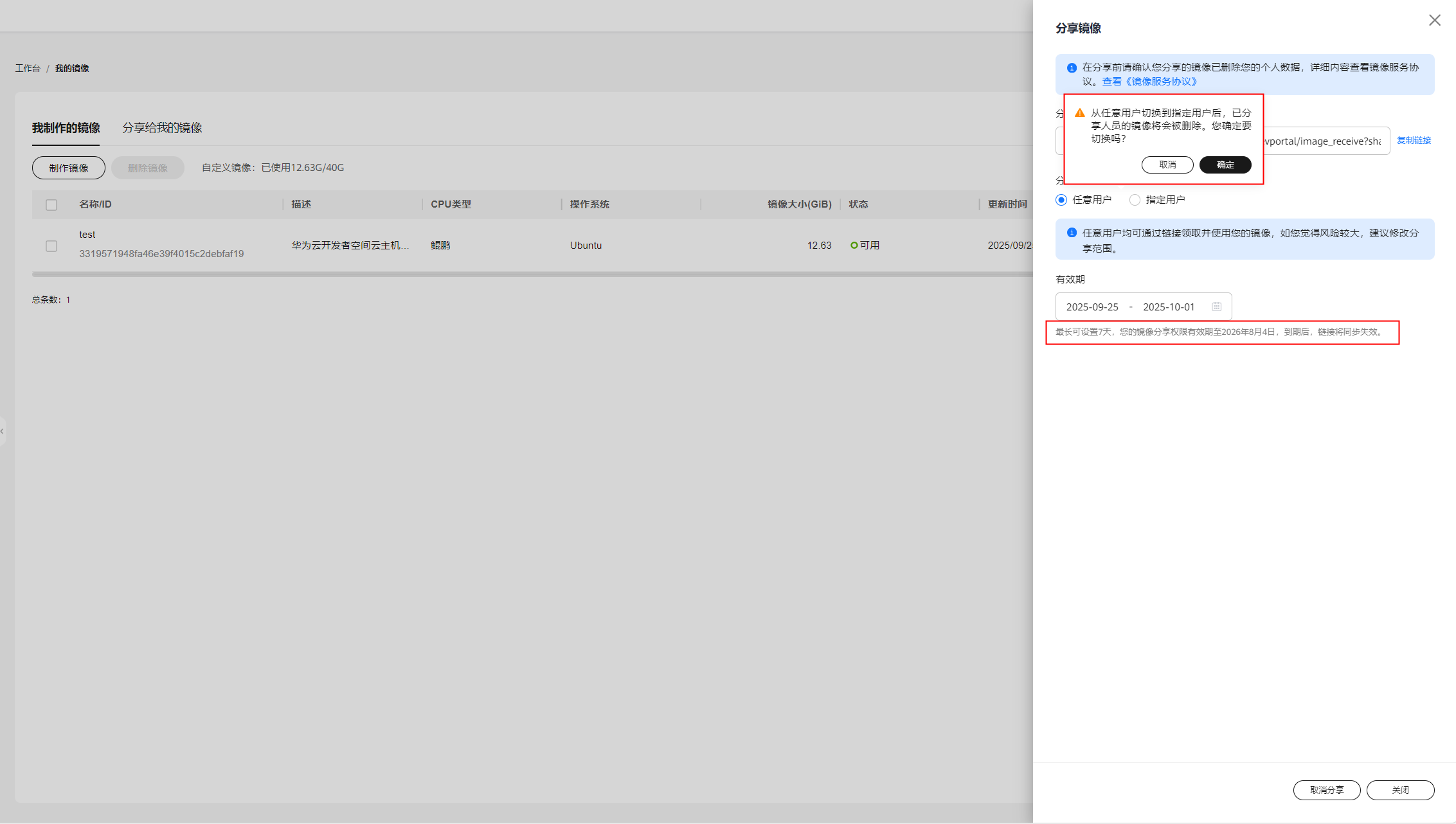 在选择任意用户时,链接有效时间范围内所有华为云账号用户均可通过分享链接领取并使用镜像。