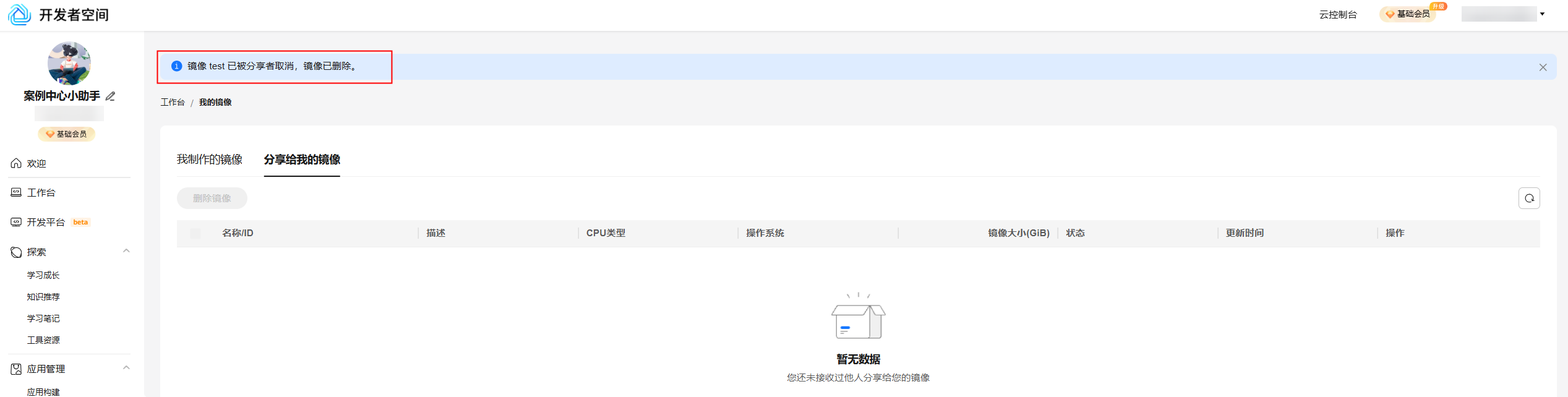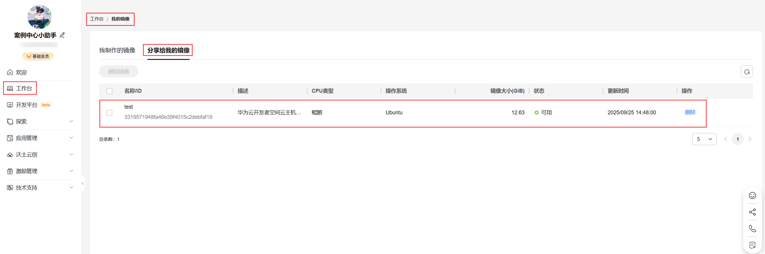 进入工作台 > 我的镜像 > 分享给我的镜像,接收分享镜像成功,列表展示被分享镜像数据。