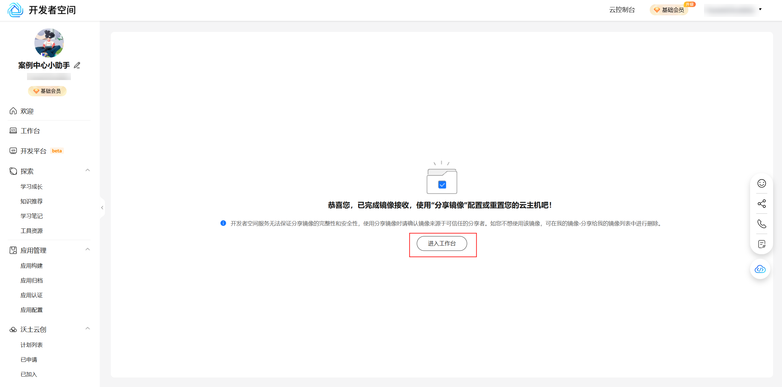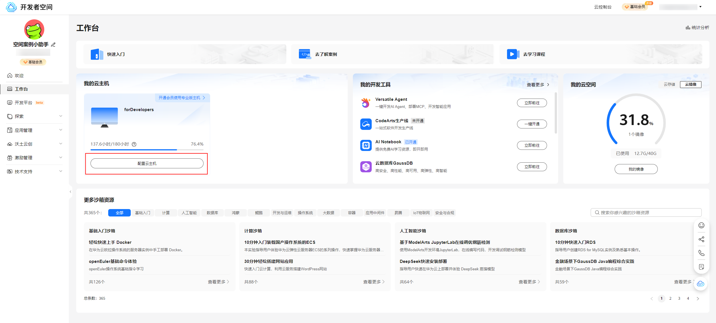 进入华为开发者空间 - 工作台界面,点击配置云主机。
