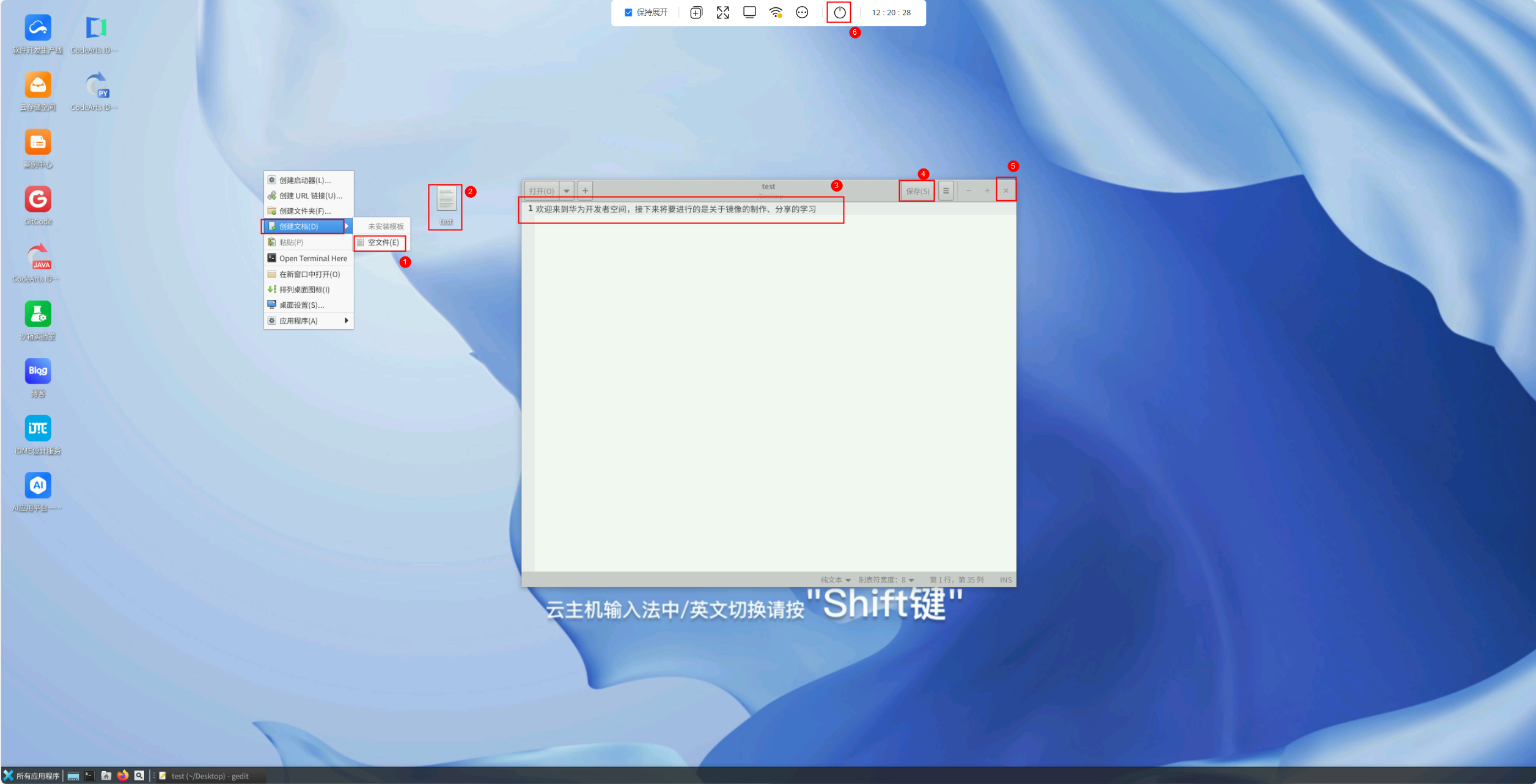 示例操作:进入云主机桌面,右键创建文档,将其命名为test,并在正文中输入欢迎来到华为开发者空间,接下来将要进行的是关于镜像的制作、分享的学习,保存,关闭文件。点云主机上方的关机,等待云主机完成关机。