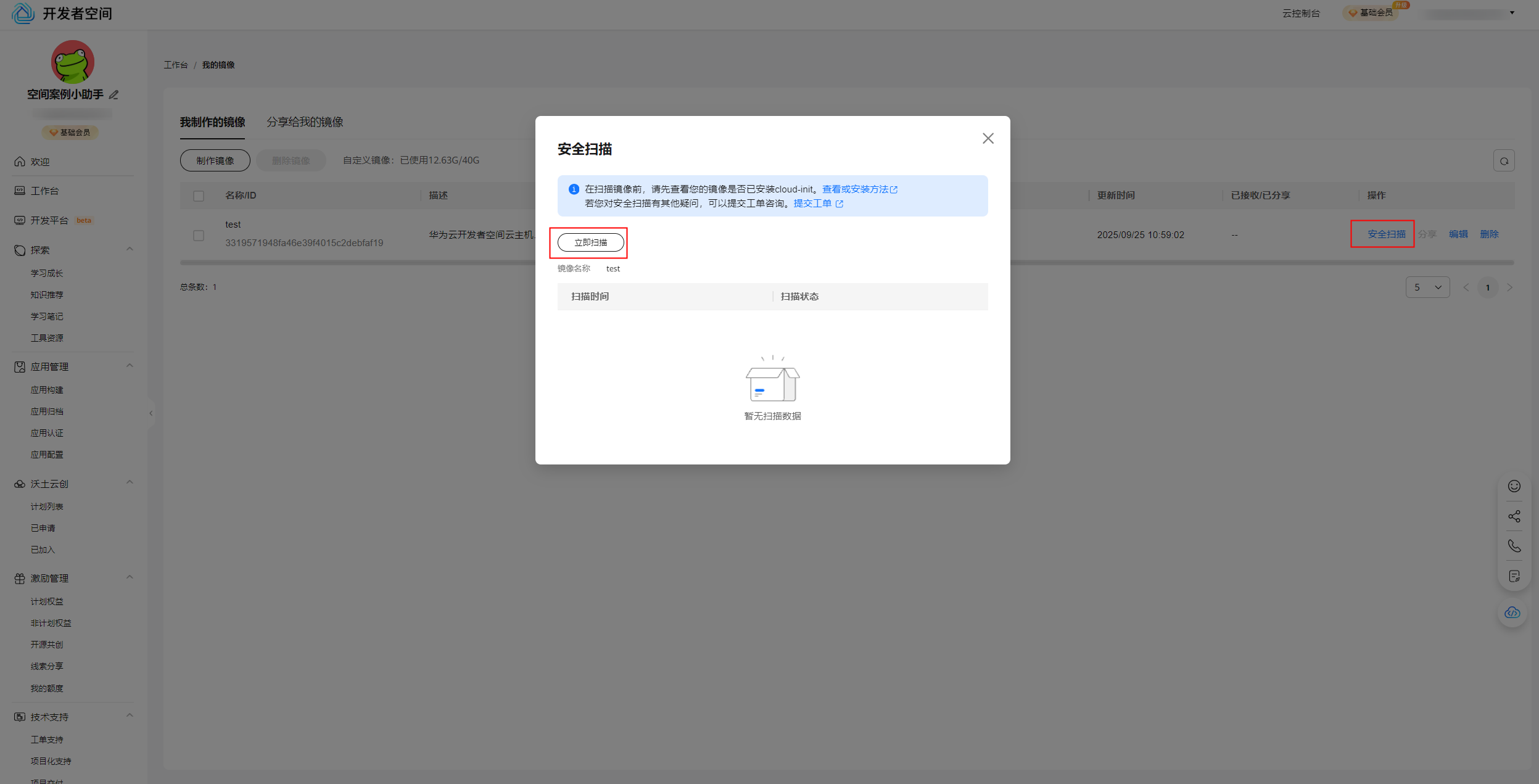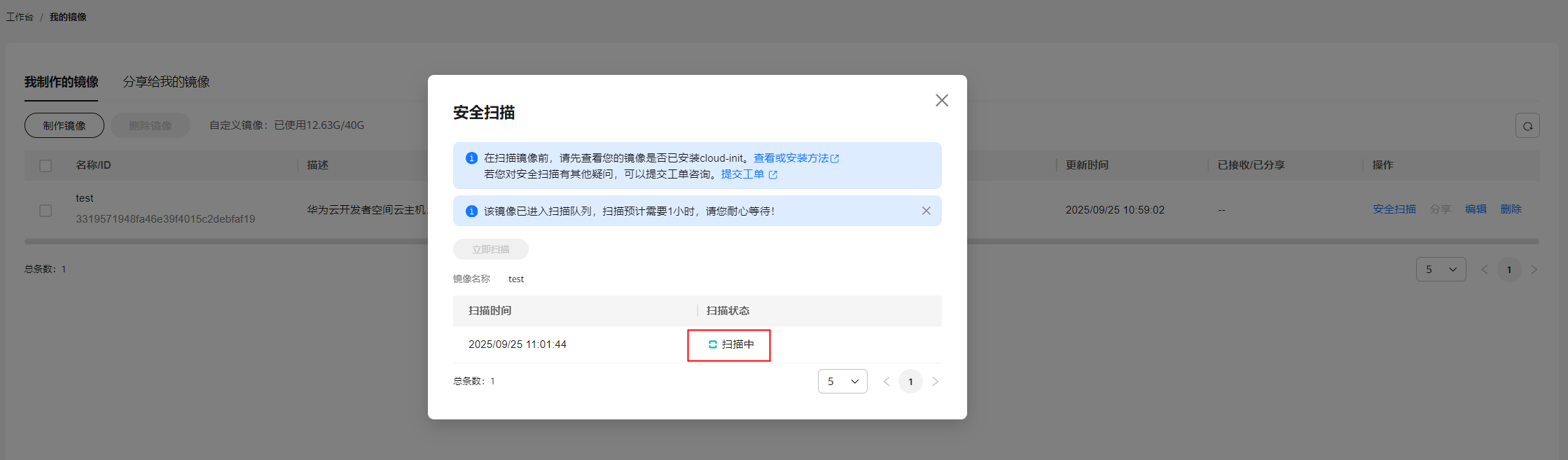 注:镜像已进入扫描队列后,扫描预计需要1小时,请您耐心等待!