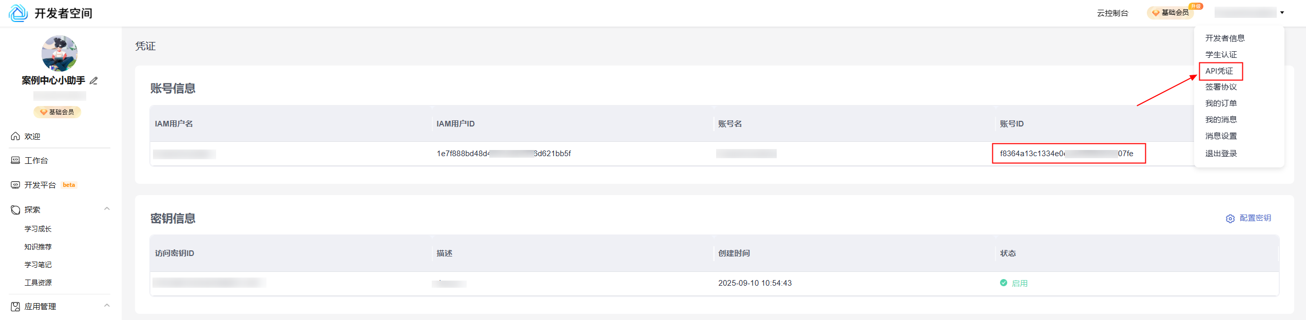 - 用户id获取方式:在开发者空间顶部 > 账号 > API凭证,进入凭证 > 账号信息板块,其中的账号ID,即为此处的用户id。