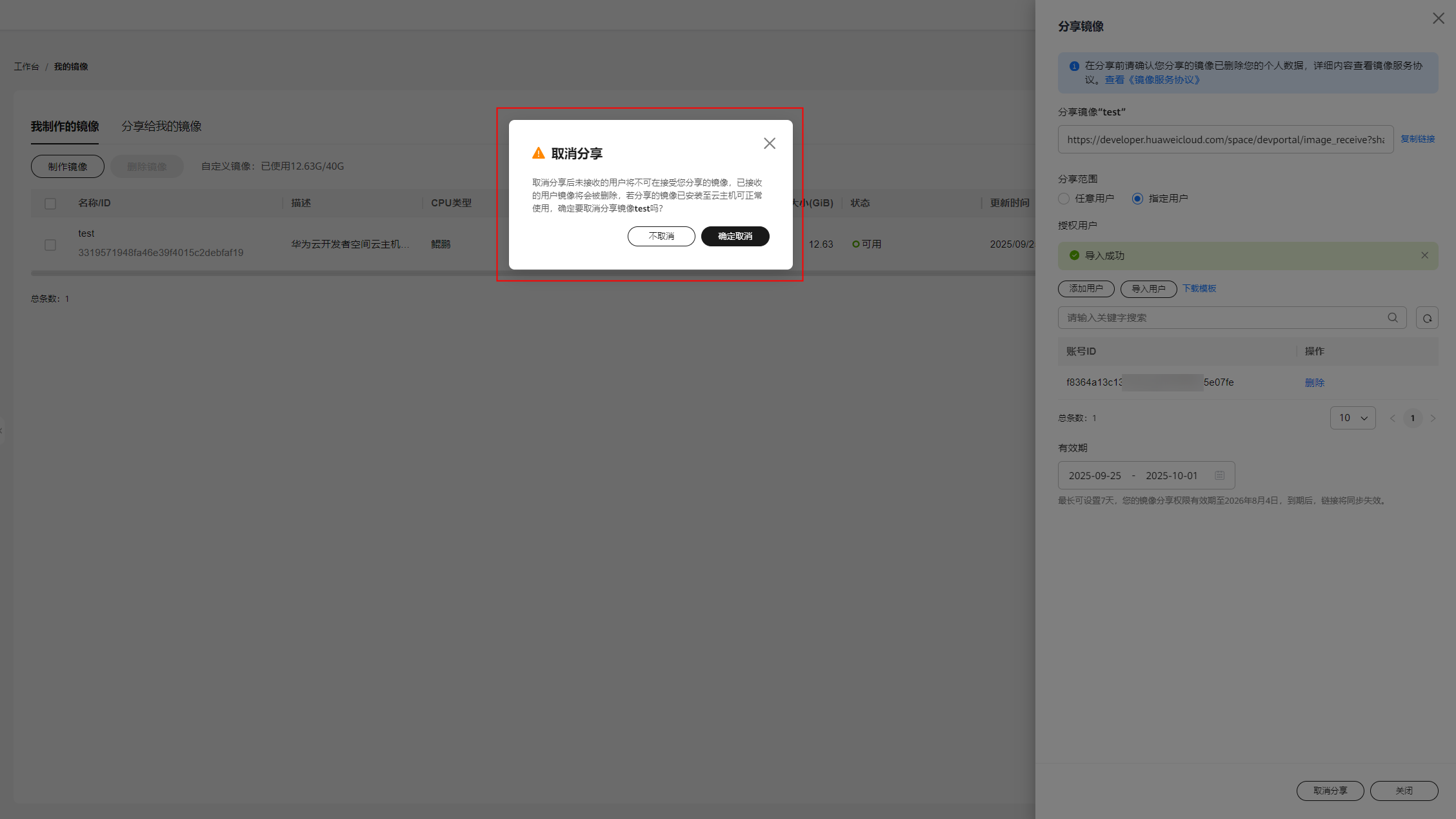 - 链接超出有效性时间范围或指定用户切换到任意用户时,未接收分享镜像的用户将不可再接收,已接收的用户镜像将会被删除,若分享的镜像已安装至云主机则可正常使用。