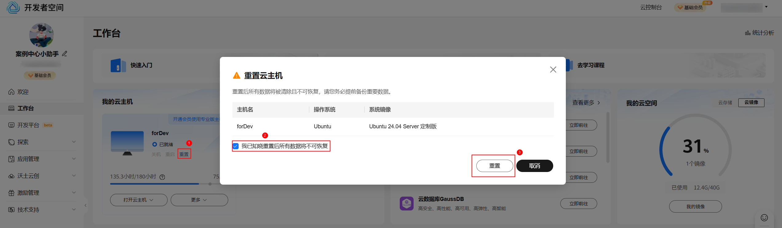 进入华为开发者空间 - 工作台,在我的云主机卡片页,点击关机,关机完成后,云主机处于已就绪状态。此时点击我的云主机卡片页的重置。