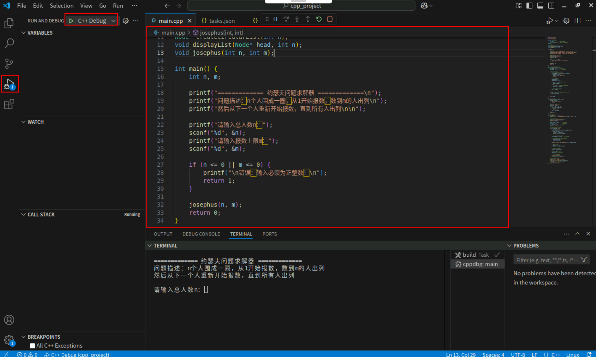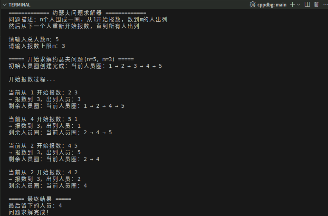 printf("\n===== 开始求解约瑟夫问题(n=%d, m=%d) =====\n", n, m);