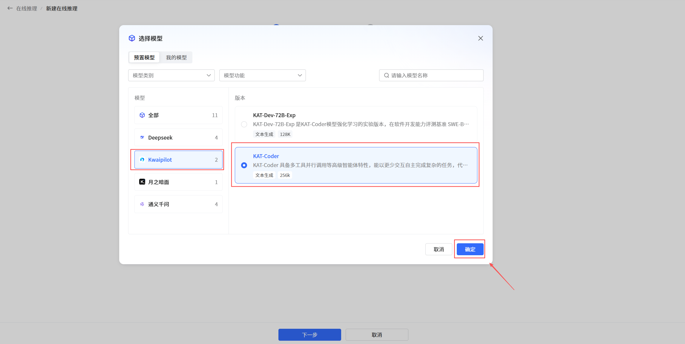 模型选择Kwaipilot,版本选择KAT-Coder,然后点确定。