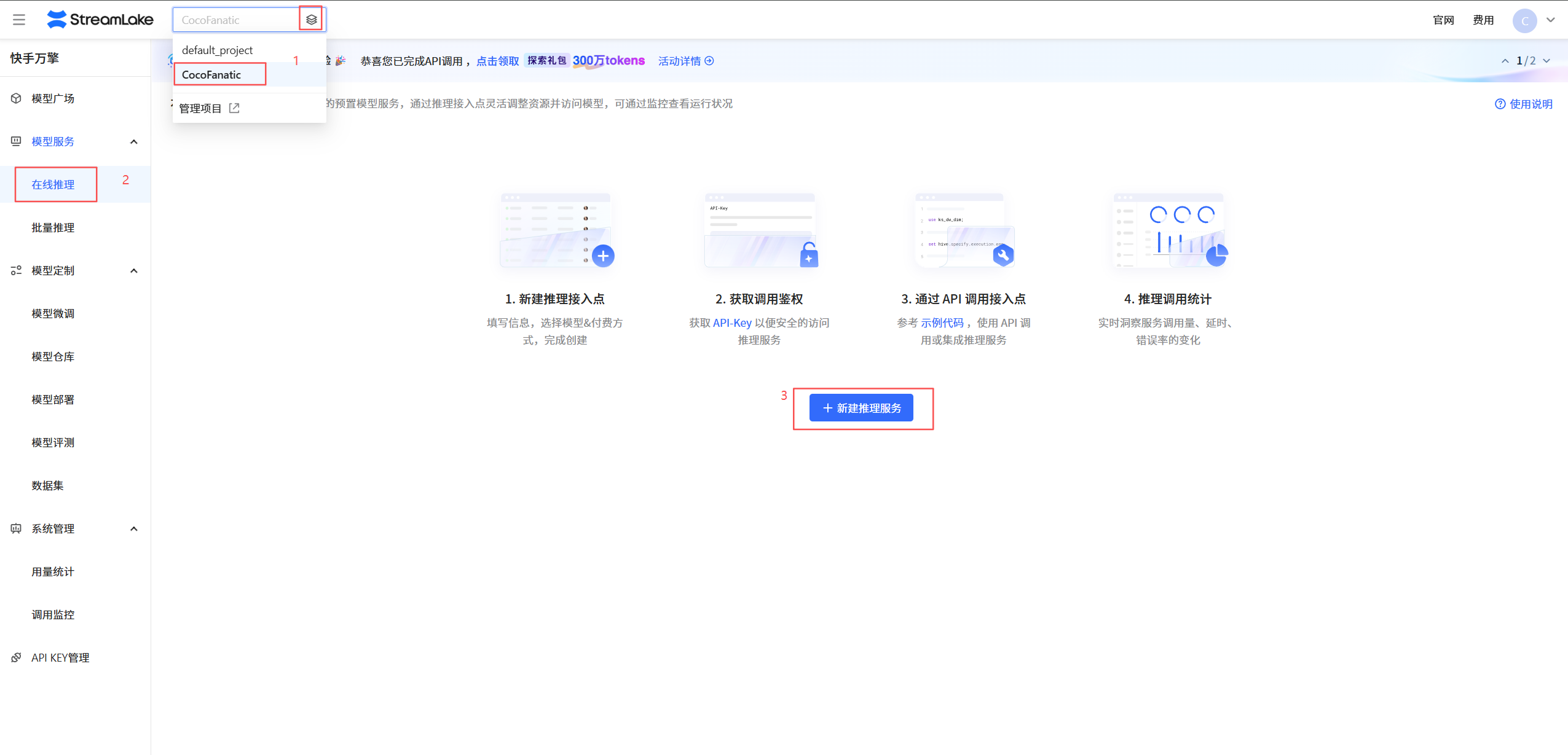 然后在左侧菜单栏选择模型服务 > 在线推理,右侧点新建推理服务。
