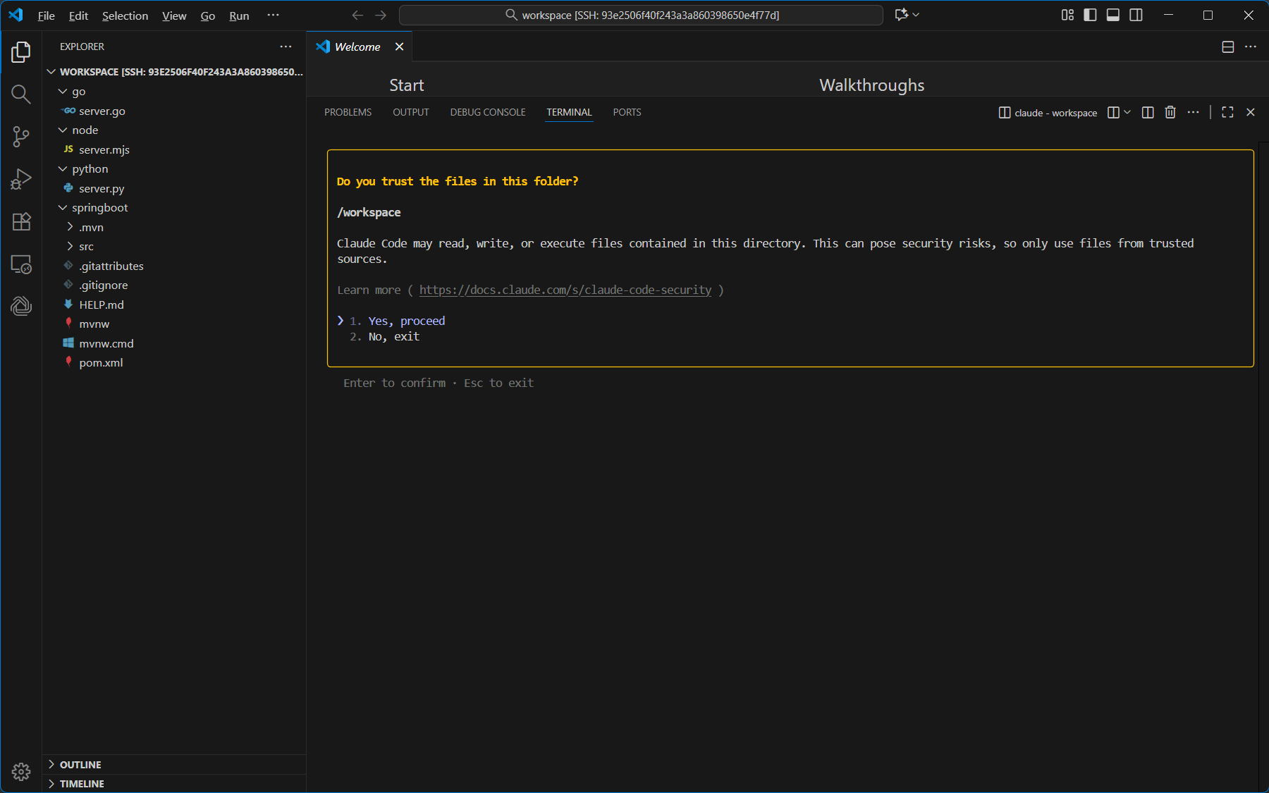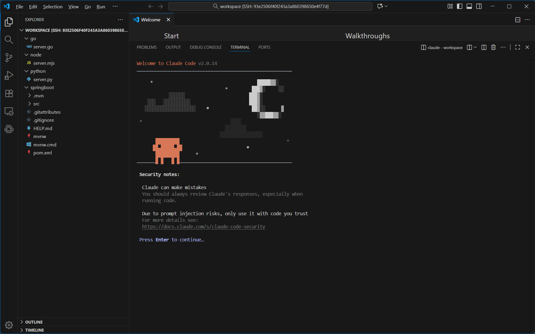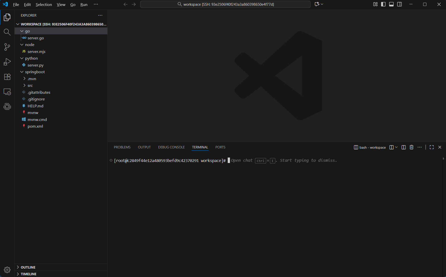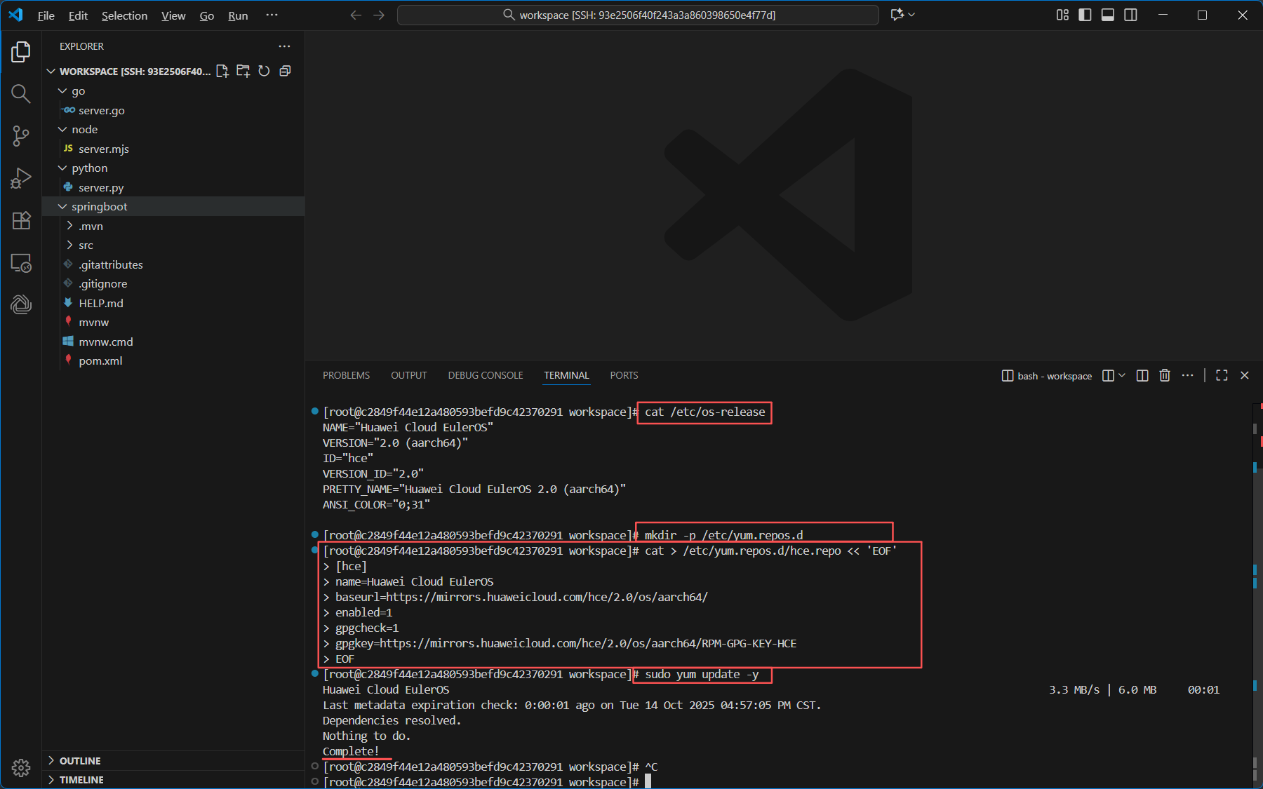 然后参考“2. VS Code远程操作云开发环境(容器)”节中的“2.2.1 打开”内容,打开云开发环境Remote SSH远程连接。连接之后的界面如下: