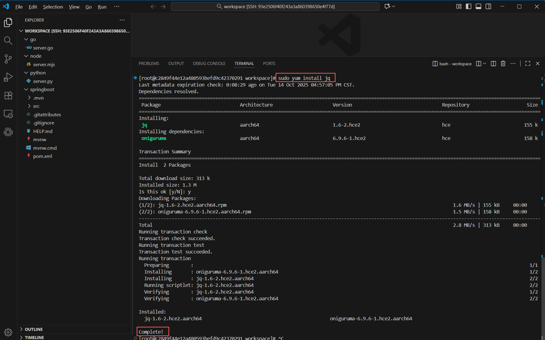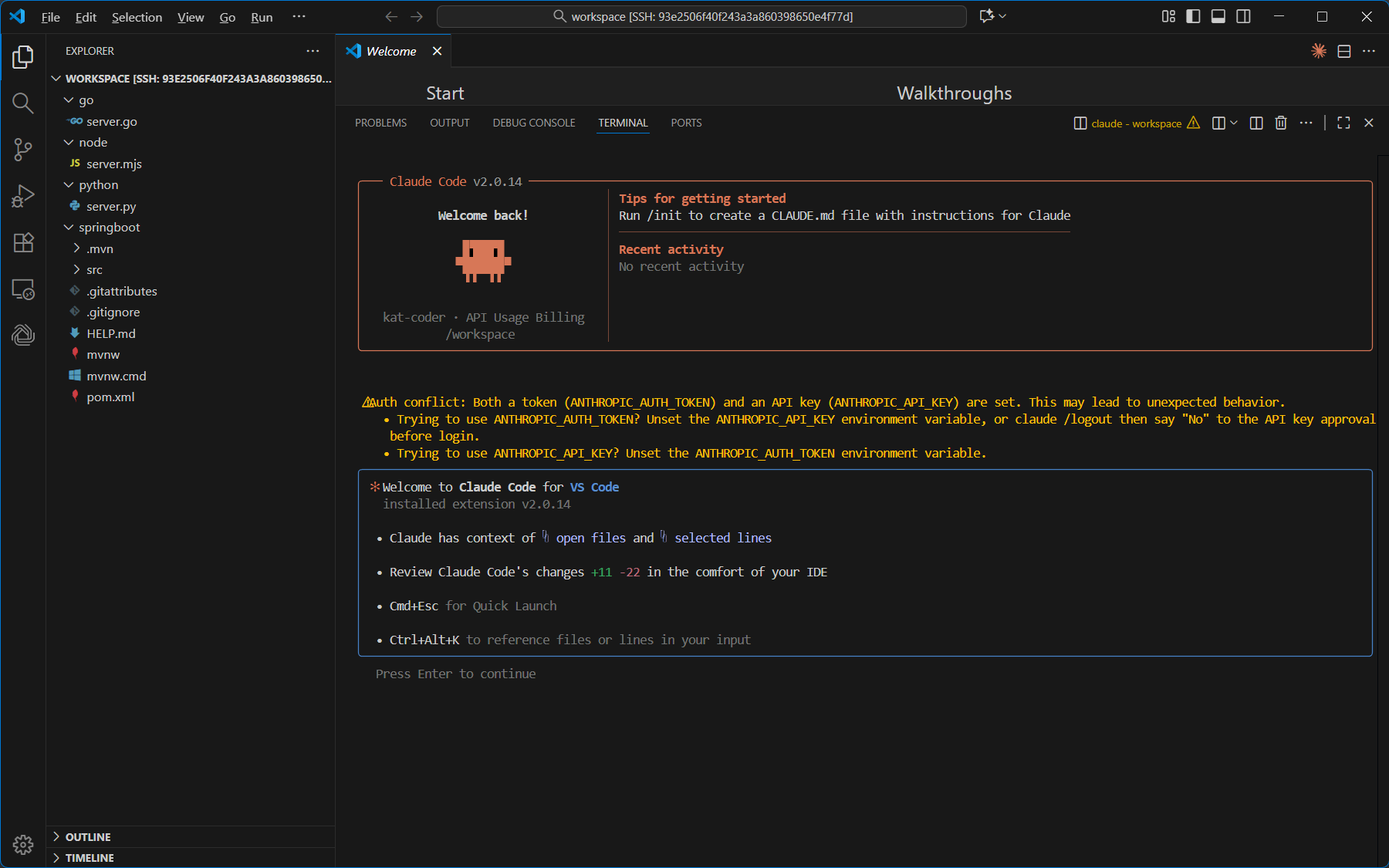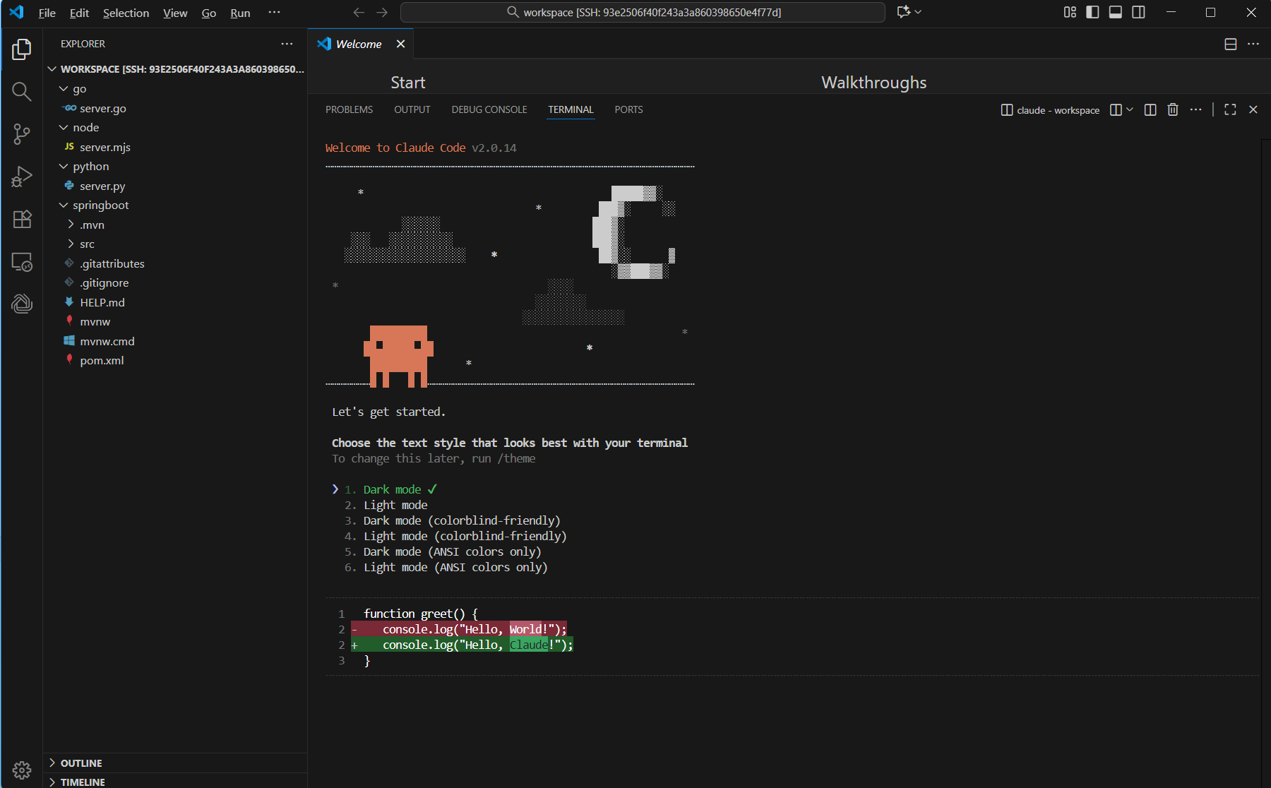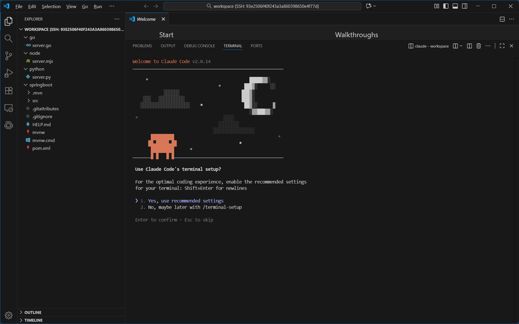 然后参考“2. VS Code远程操作云开发环境(容器)”节中的“2.2.1 打开”内容,打开云开发环境Remote SSH远程连接。连接之后的界面如下: