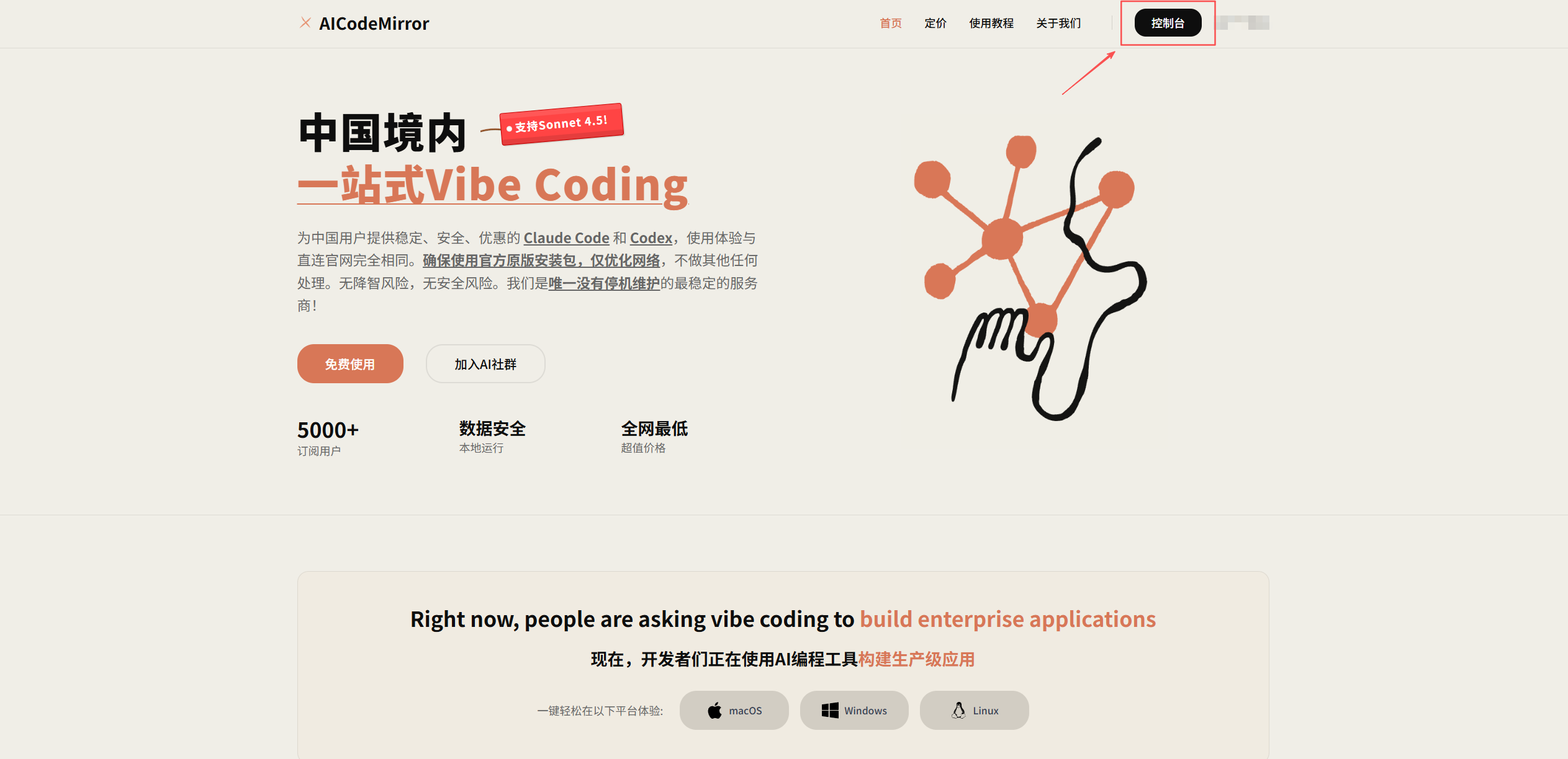 浏览器注册并登录Claude Code官网:https://www.aicodemirror.com/,点右上角控制台。