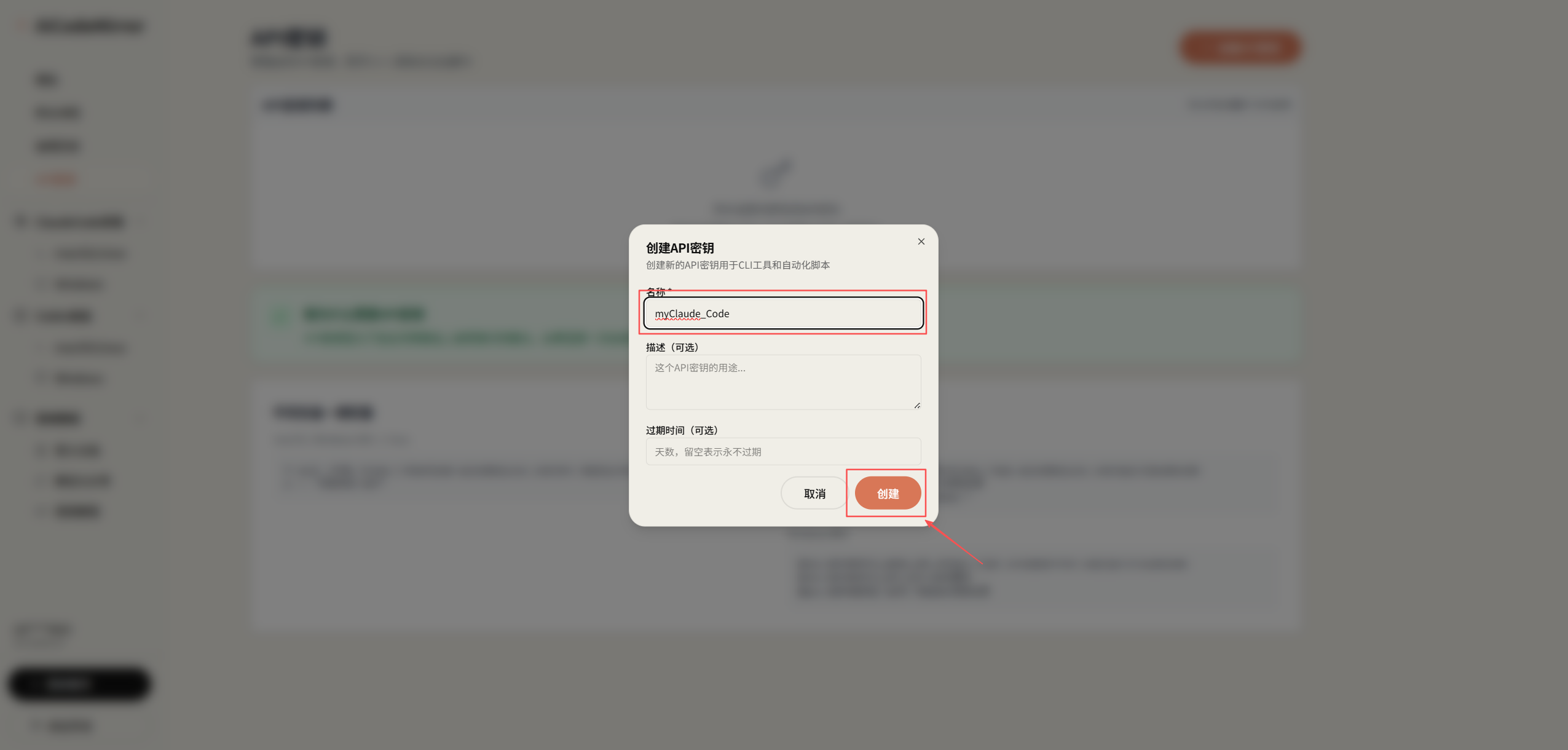 编辑API密钥名称,样例:myClaude_Code,然后点创建。