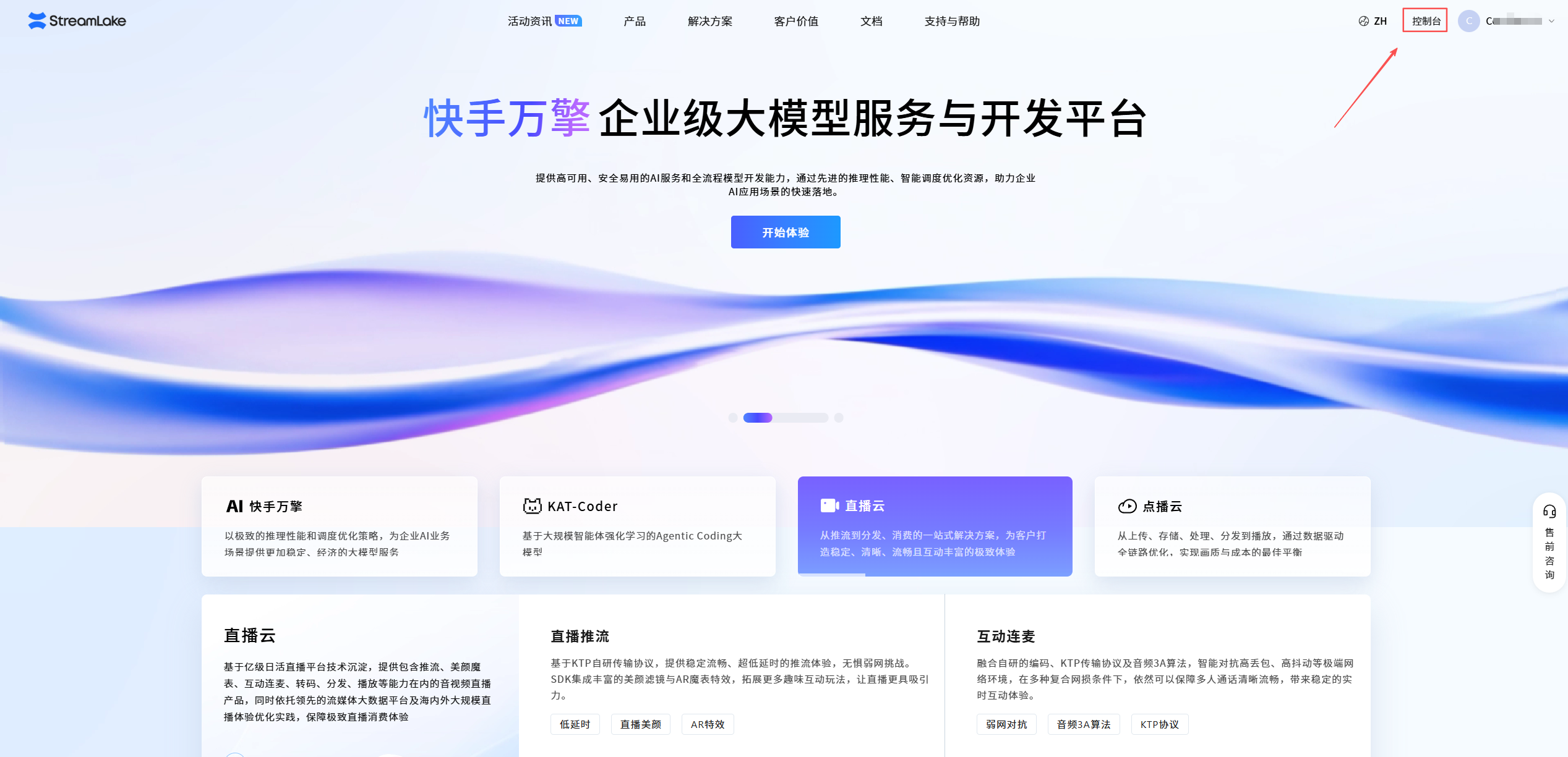 浏览器注册并登录快手万擎官网:https://www.streamlake.com/,点右上角控制台。