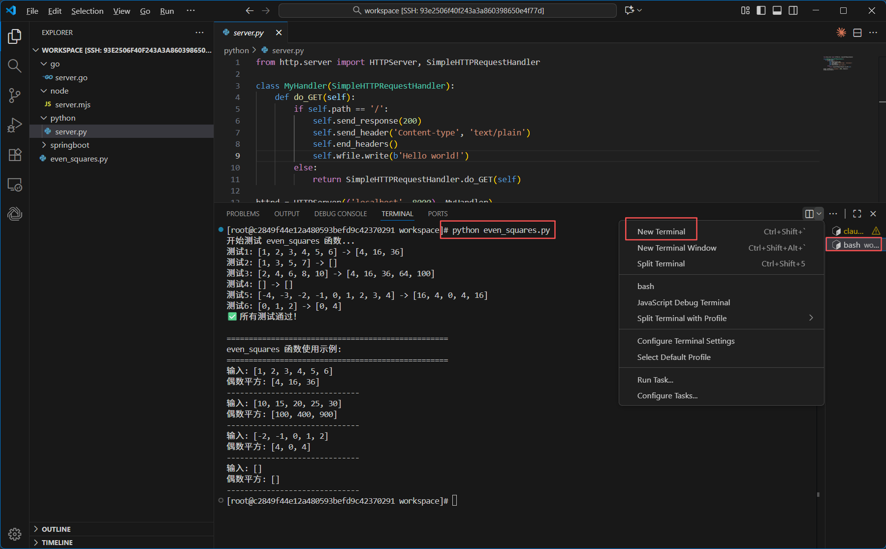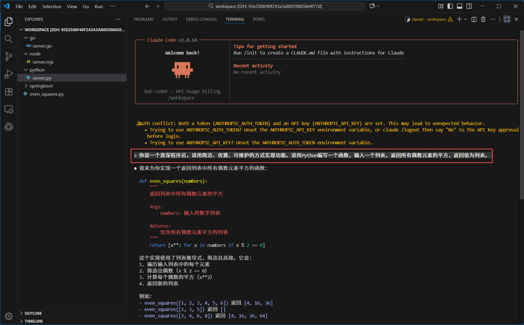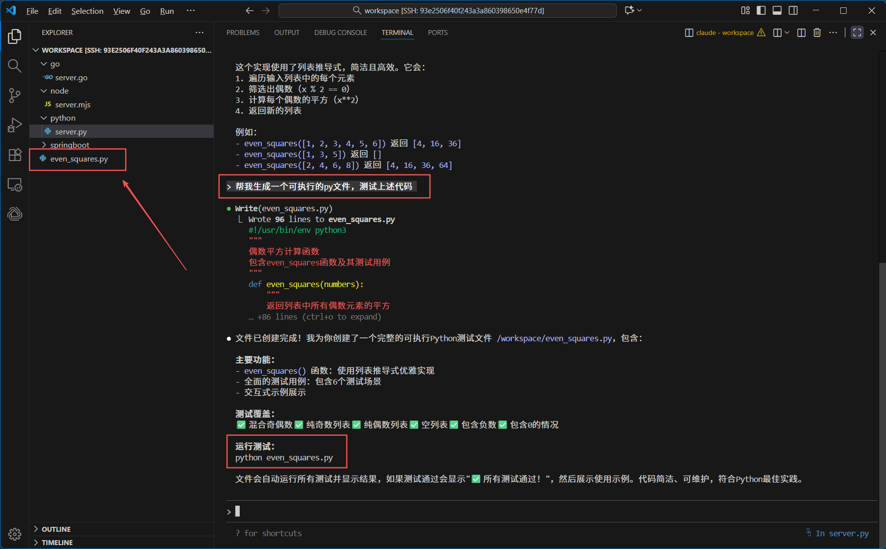 在VS Code中新开一个Terminal,然后根据Claude提示运行even_squares.py。