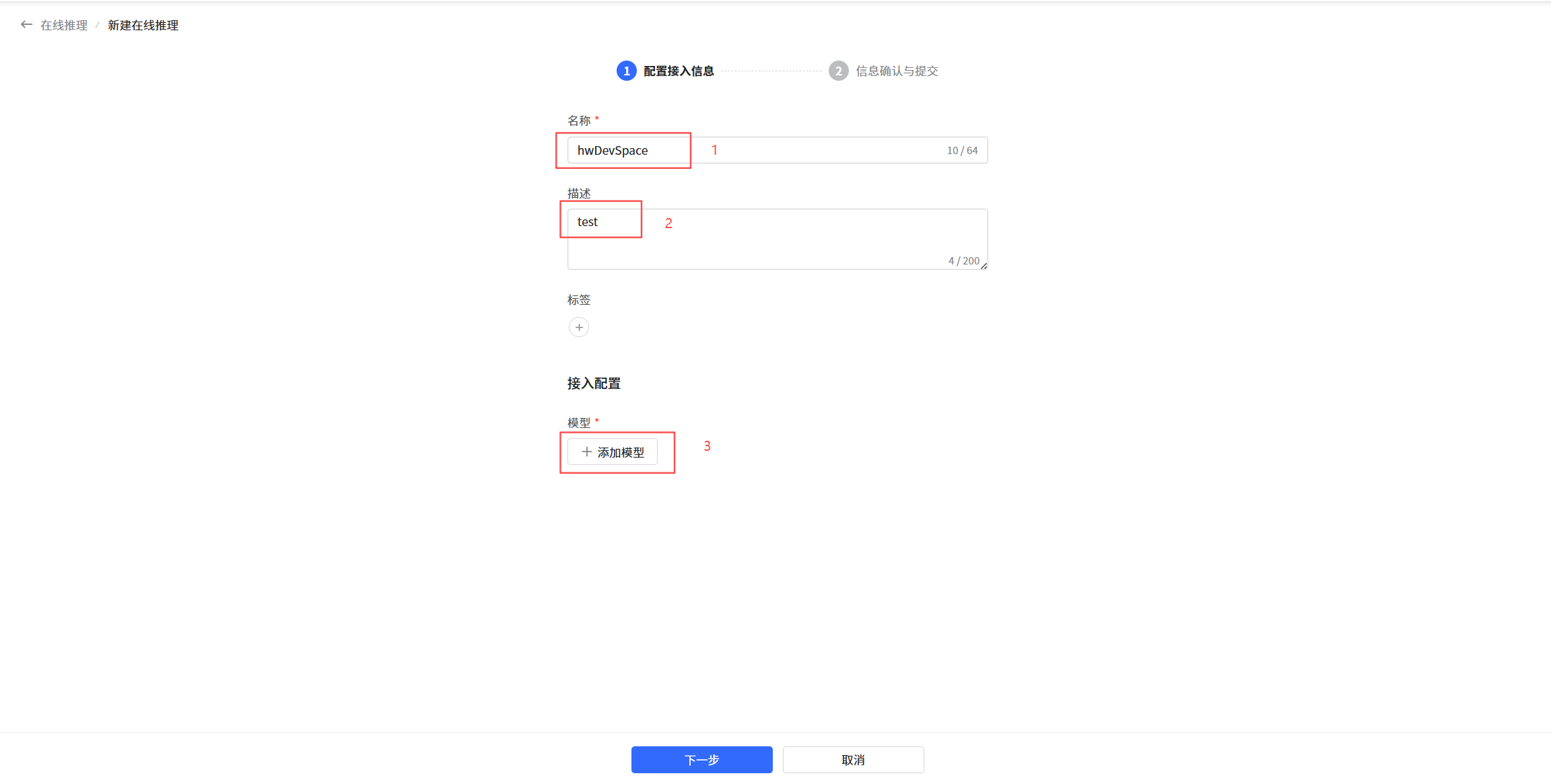 在配置接入信息页面填写名称和描述,然后点添加模型。