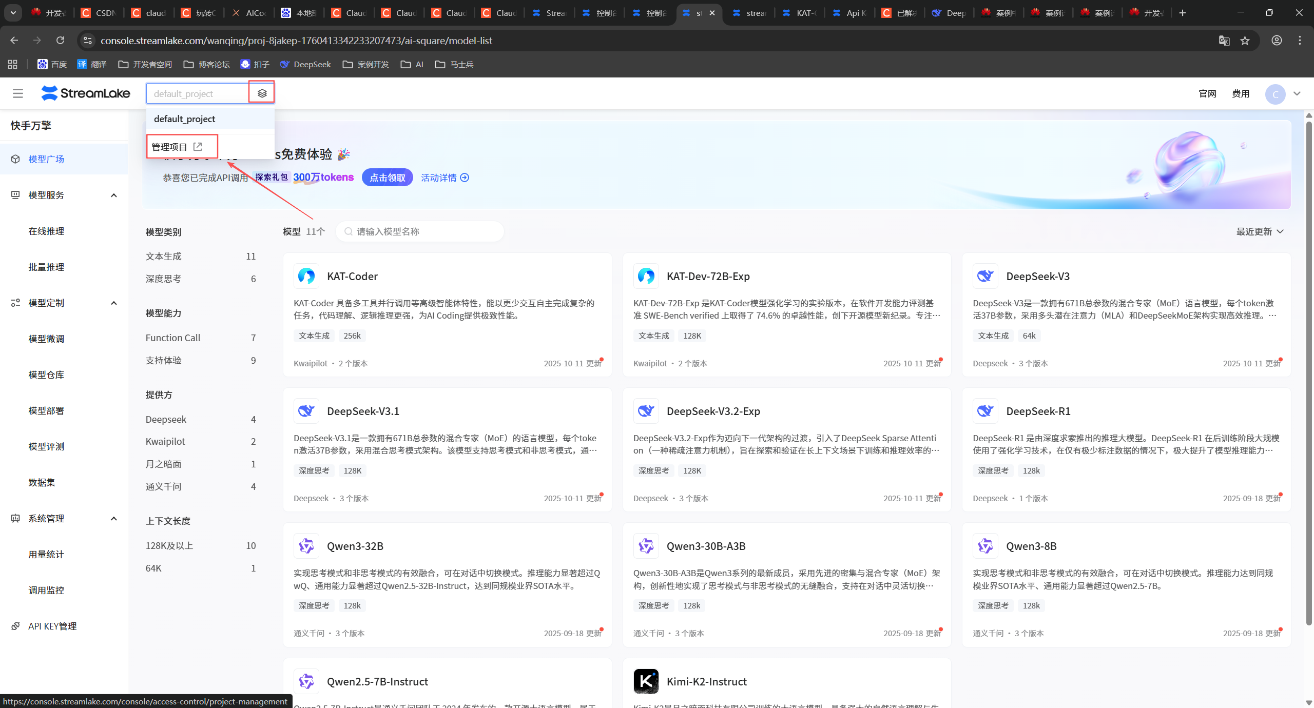 - 注册并登录快手万擎官网,领取KAT-Coder免费百万tokens;