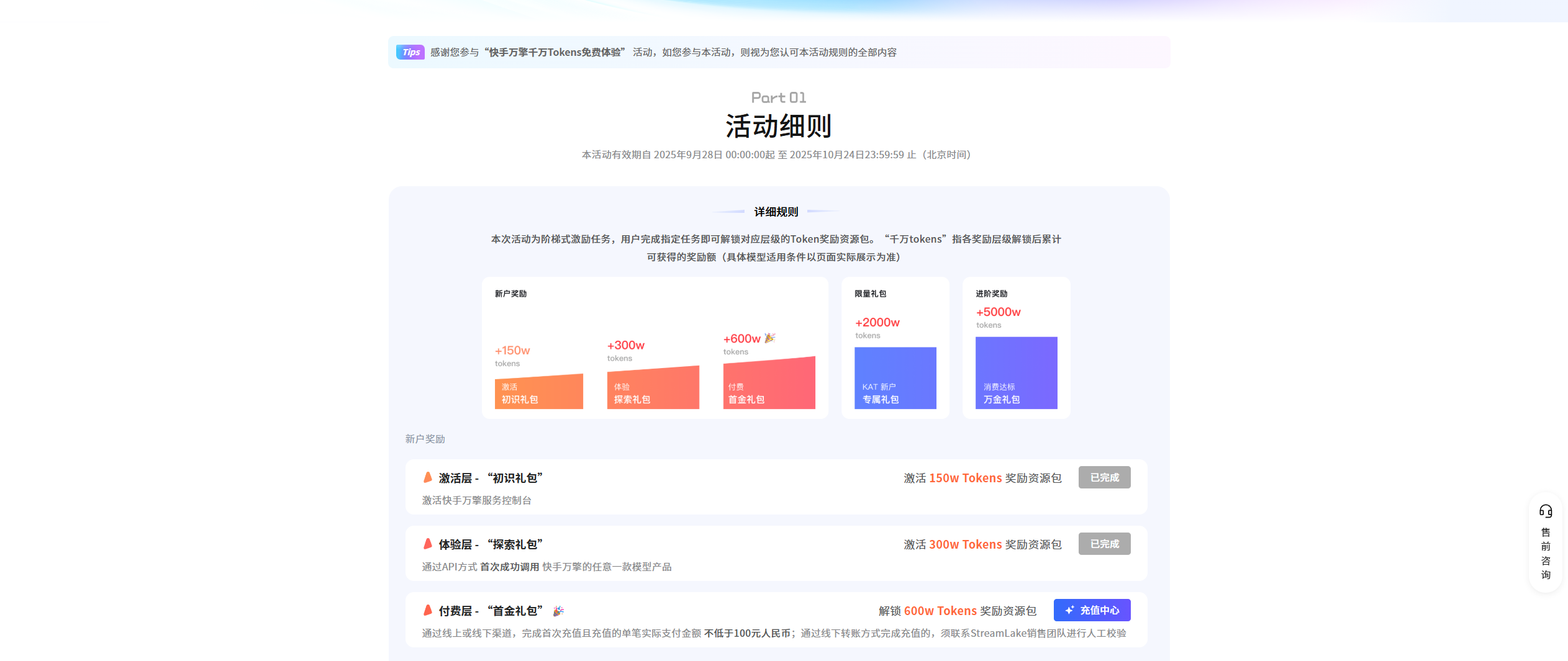 注:本案例中因参与**“快手万擎千万Tokens免费体验”** 活动,激活加体验总共获取450W免费tokens,无需额外充值。
