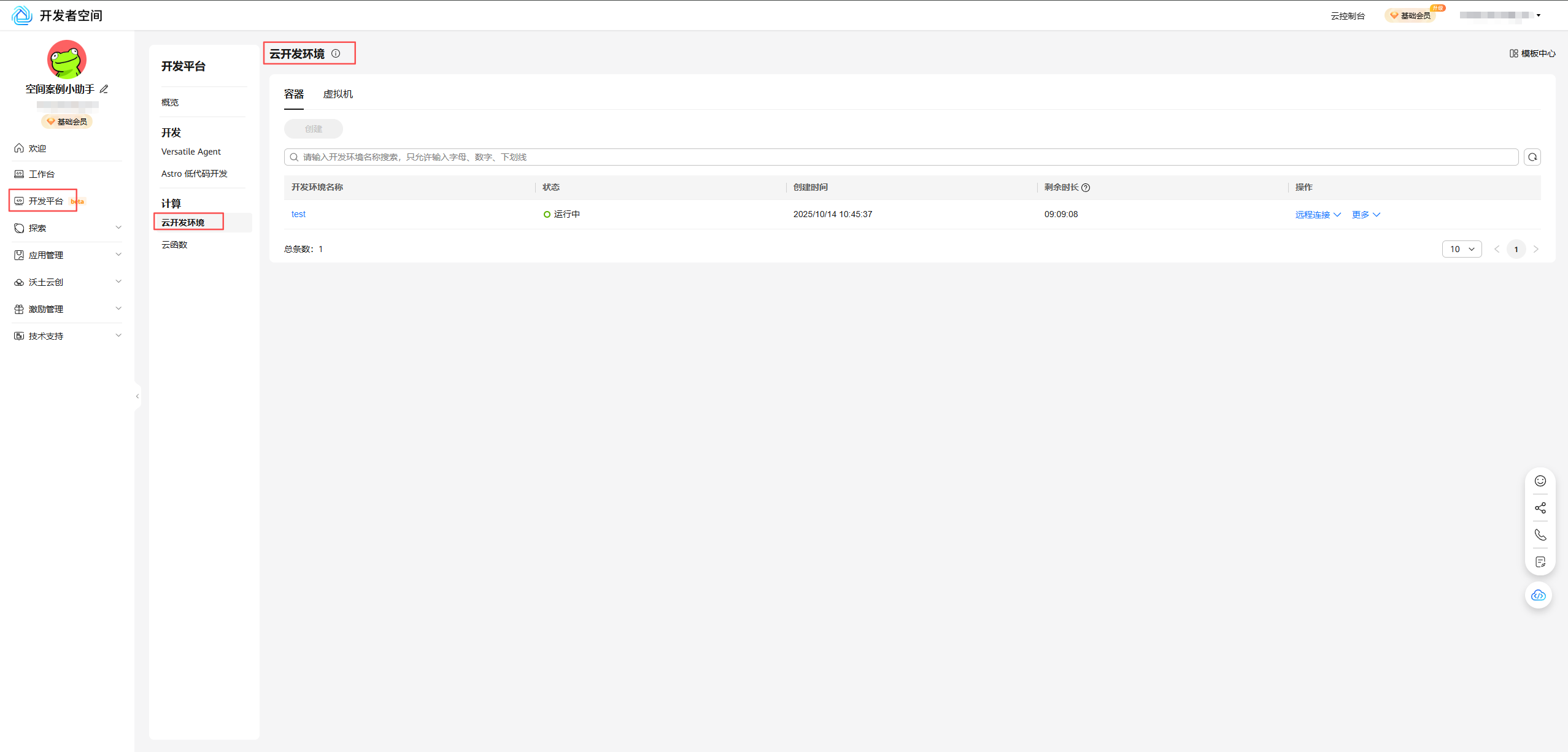 开发者可以登录华为云账号后可以直接进入华为开发者空间开发平台界面,点击云开发环境即可进入云开发环境页面。