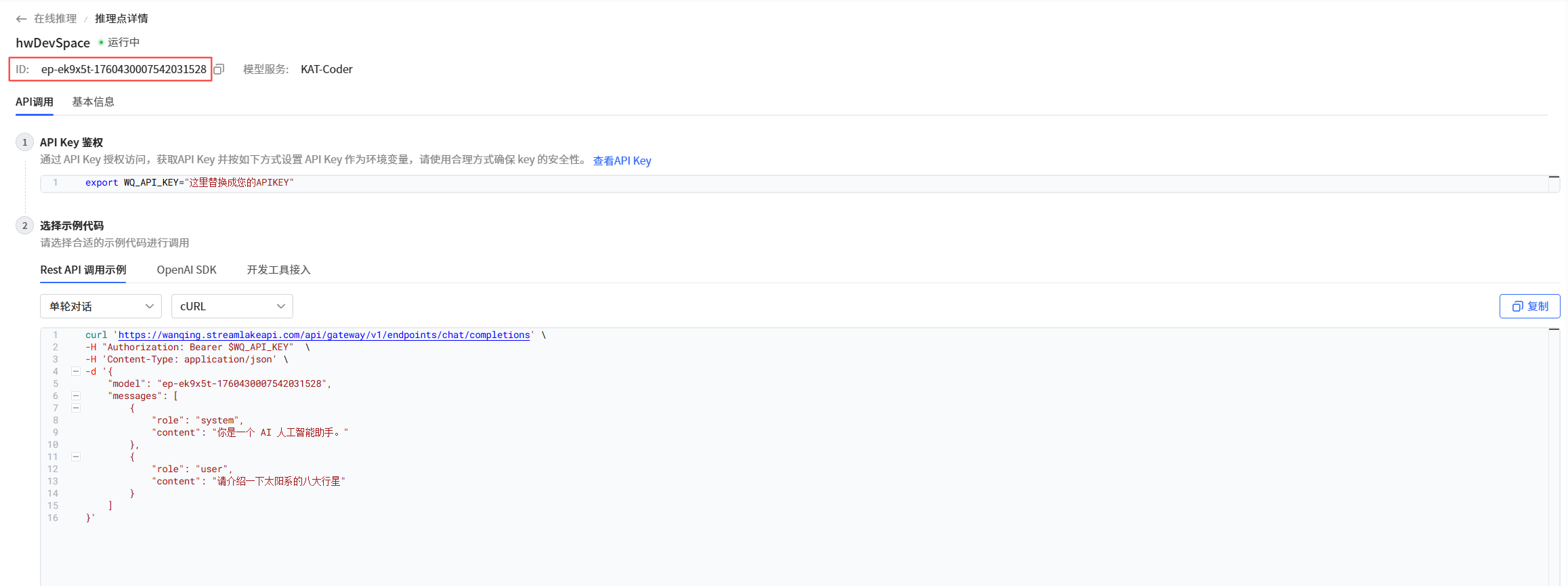 提交后自动进入hwDevSpace推理点详情页面,这里包含了API调用和基本信息。其左上角的万擎推理点 ID注意保存。