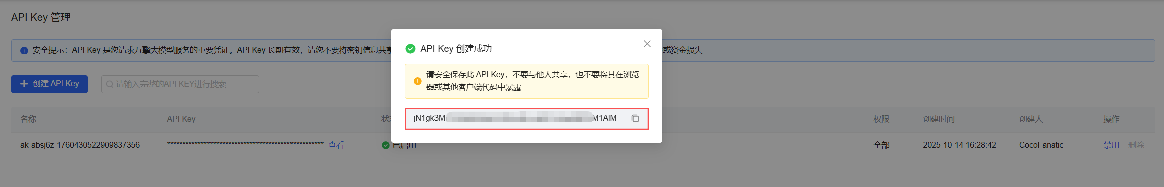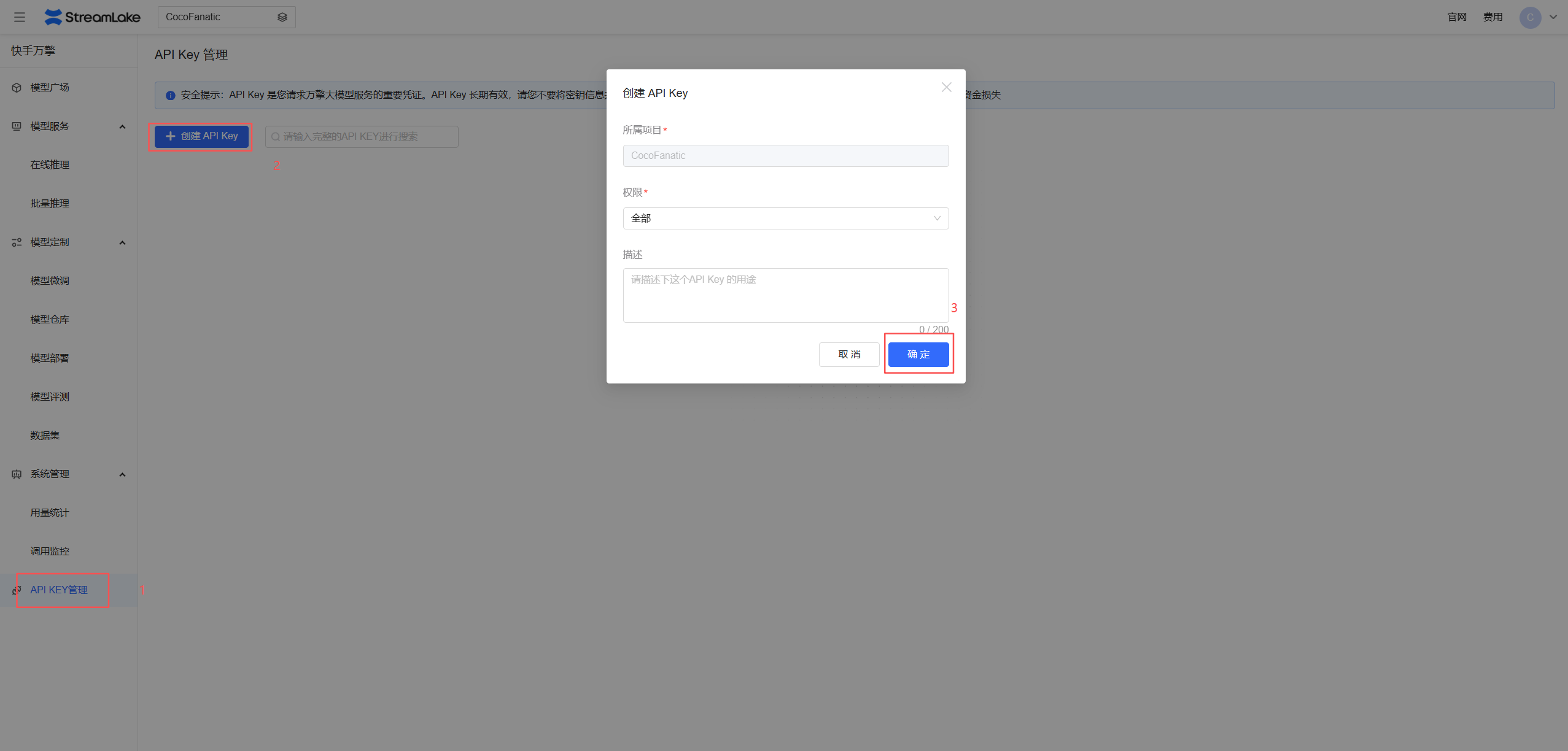 返回快手万擎控制台页面,左侧菜单选择API KEY管理,然后点左上角的创建API Key,在弹出的创建API Key对话框中直接点确定。