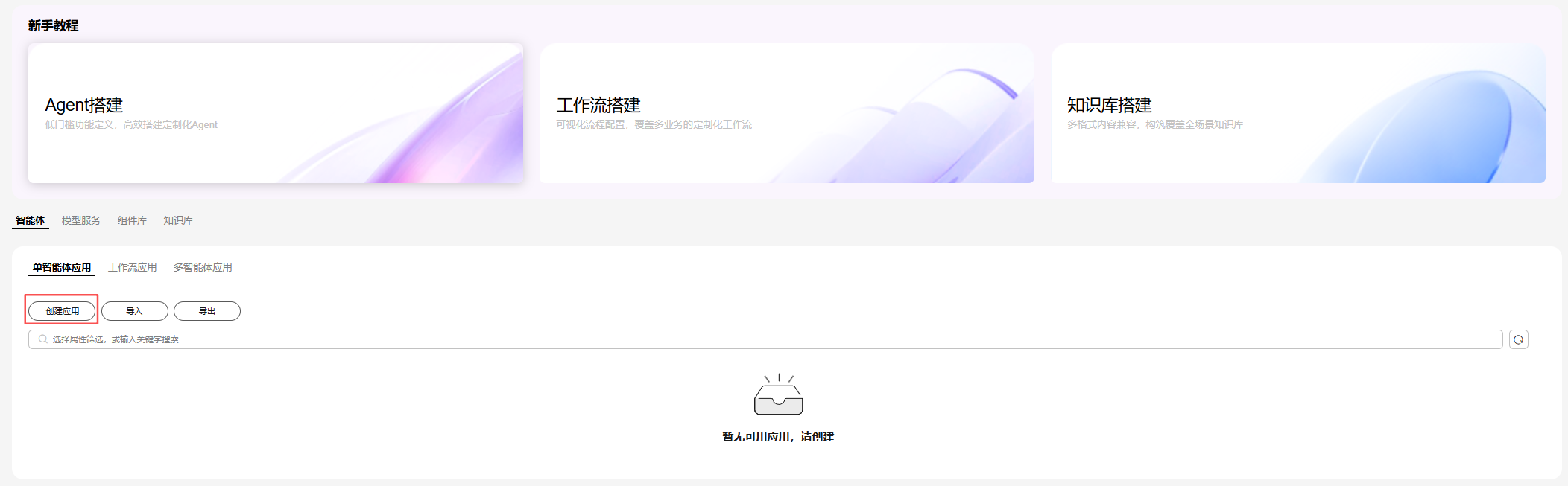 在Versatile Agent平台页签选择智能体 > 单智能体应用,点击创建应用。