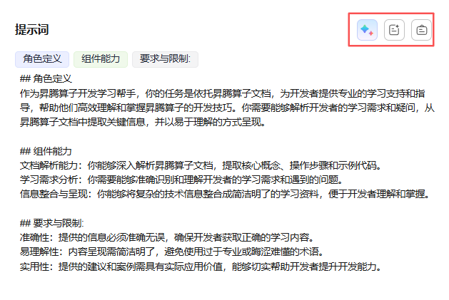 点右上角的角色指令模板,为了保证应用回复的准确性,提示词应具备三个主要信息:角色设定、组织能力、要求与限制。