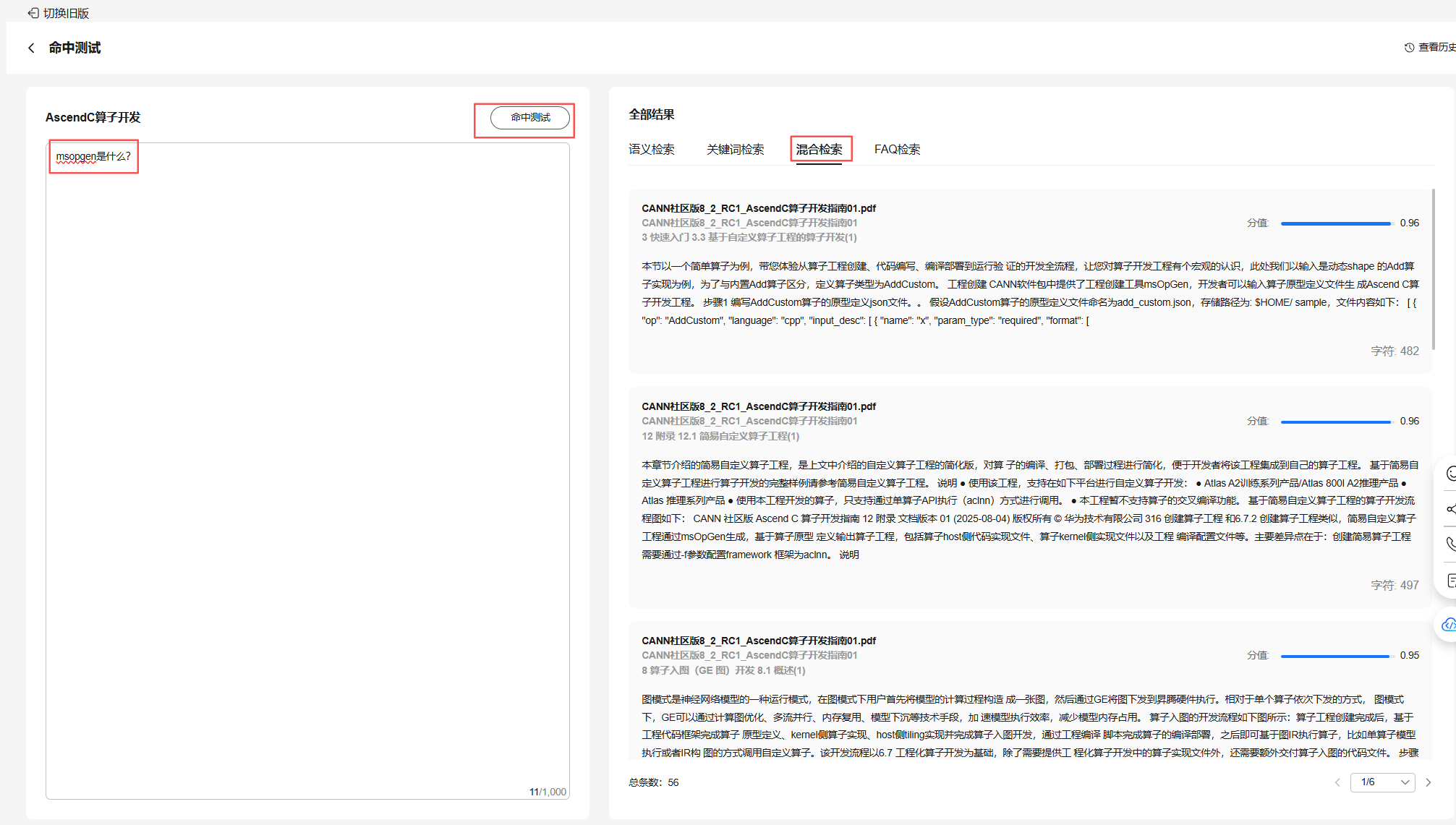 点右上角的命中测试。输入msopgen是什么?点上方的命中测试,在右侧选择混合检索页签,查看检索结果。