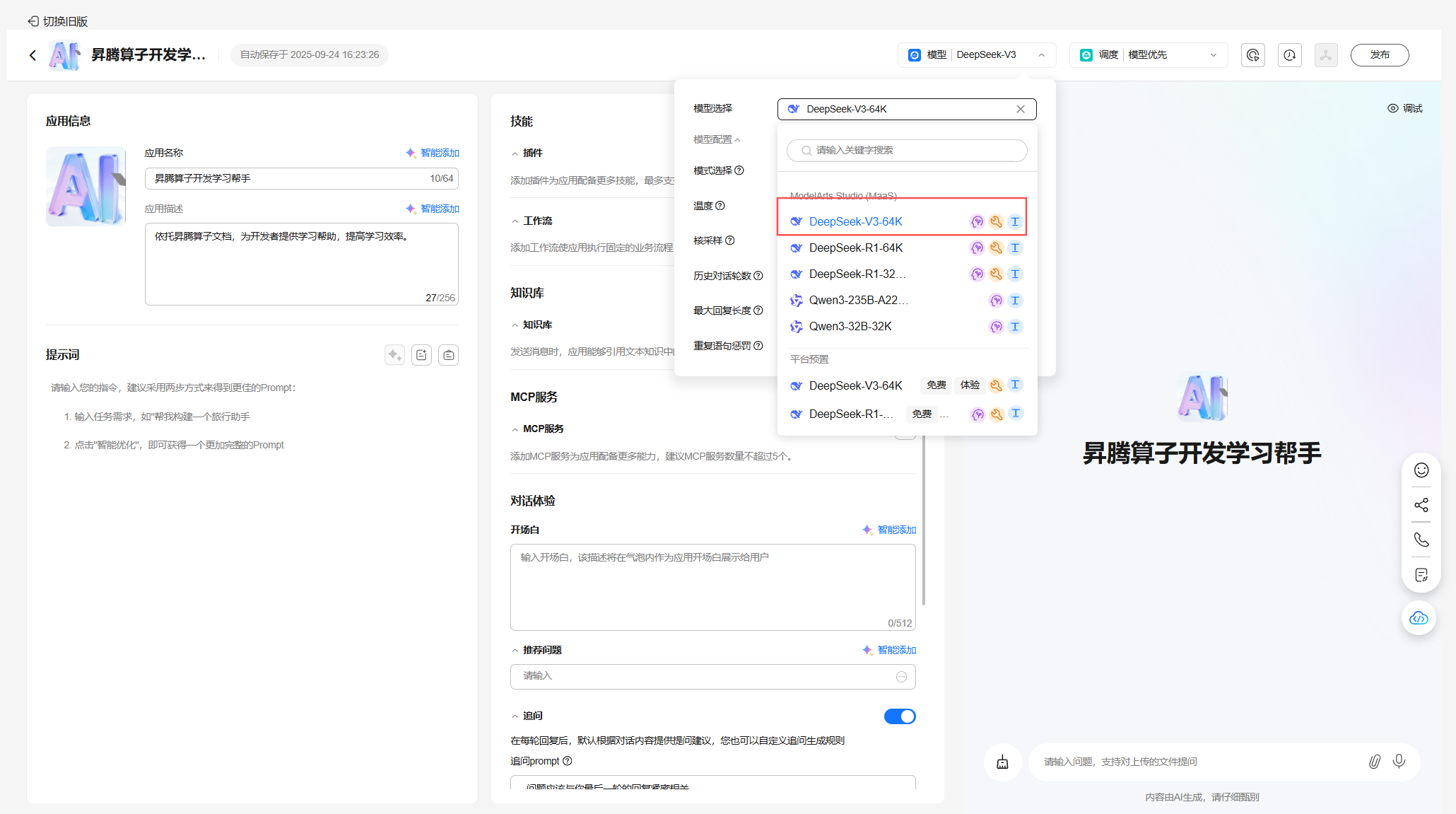 模型选择可以选择平台预置的DeepSeek,也可以选择前面“二、资源准备与基础环境配置”章中的“2. 配置模型”节配置的MaaS模型资源。为了保证应用的运行不受资源限制影响,这里选择ModelArts Studio(MaaS)模型服务中的DeepSeek-V3-64K。