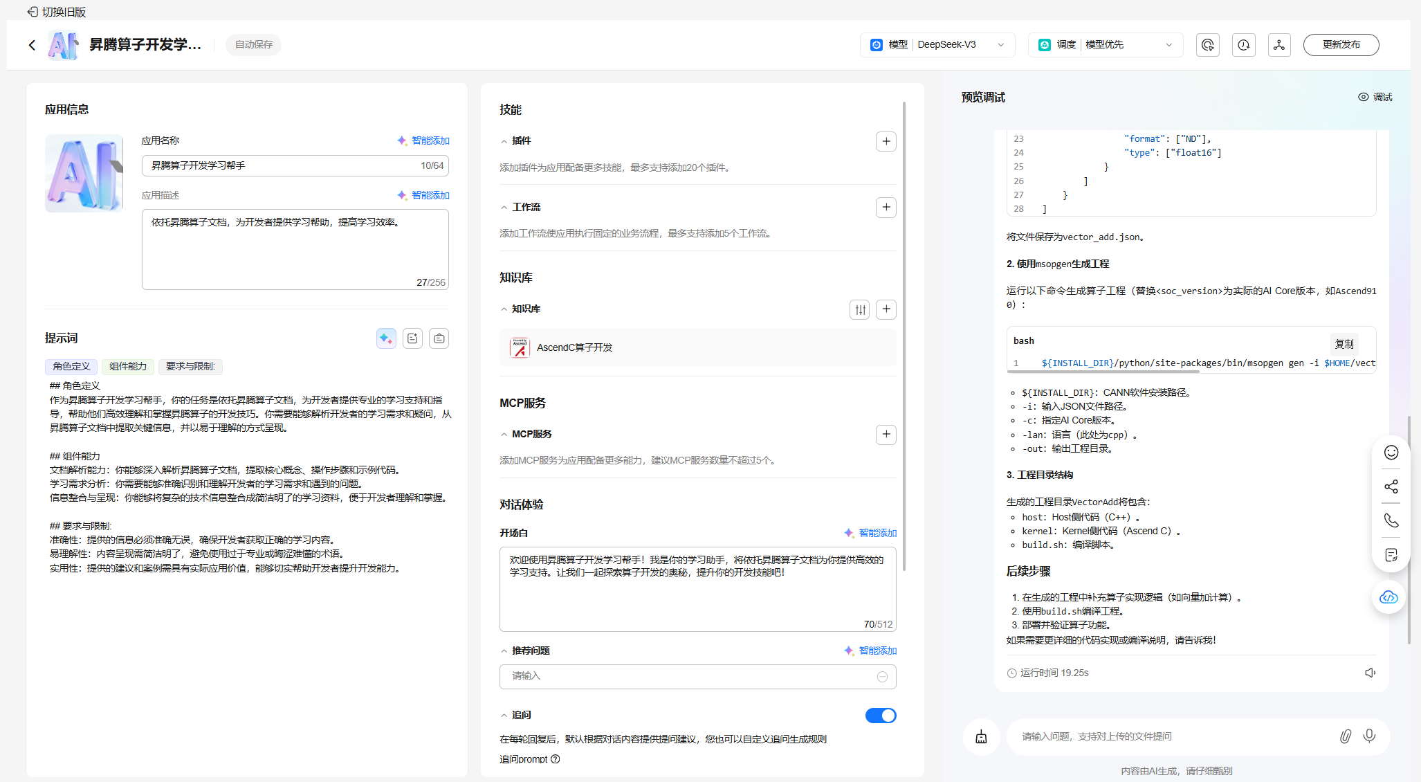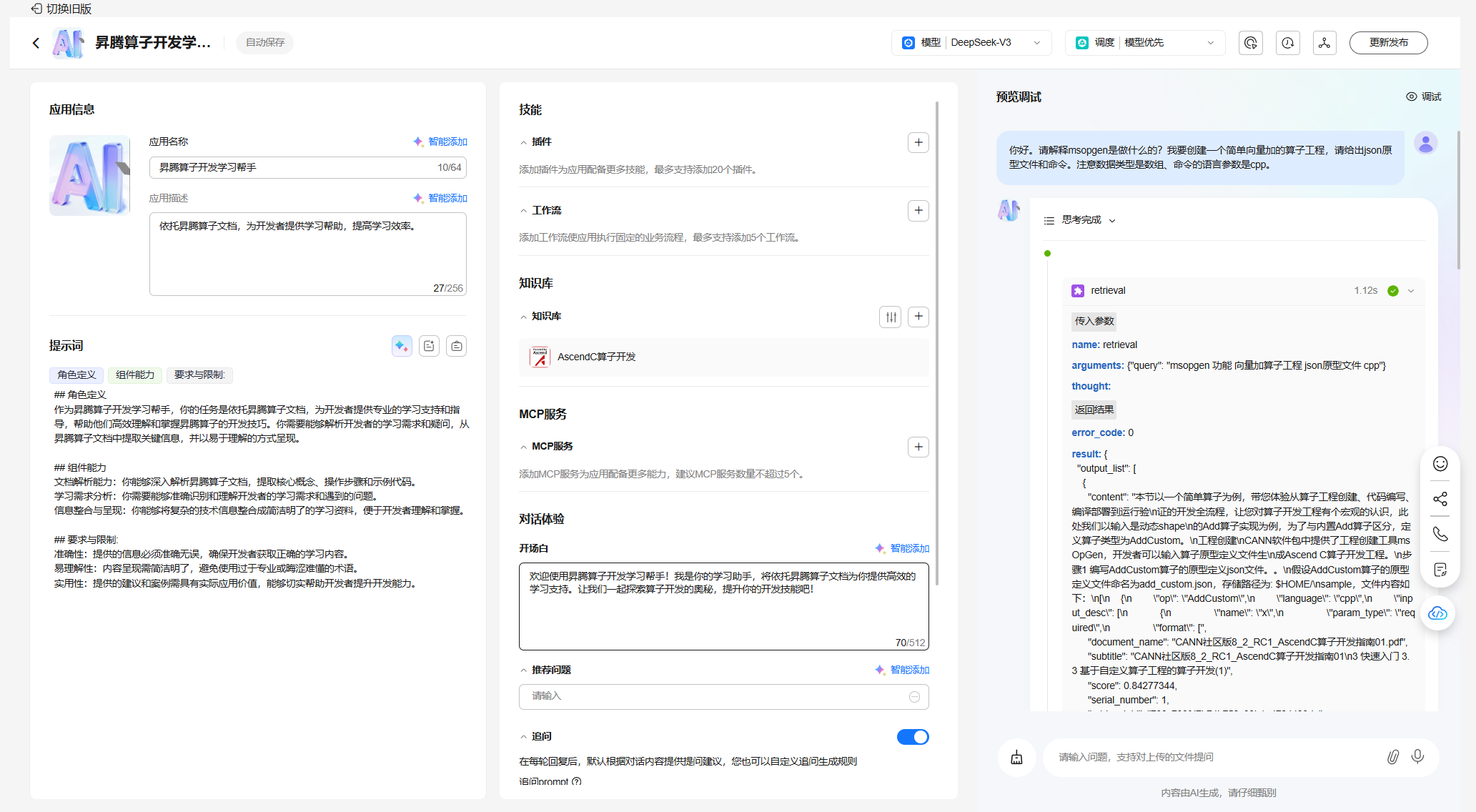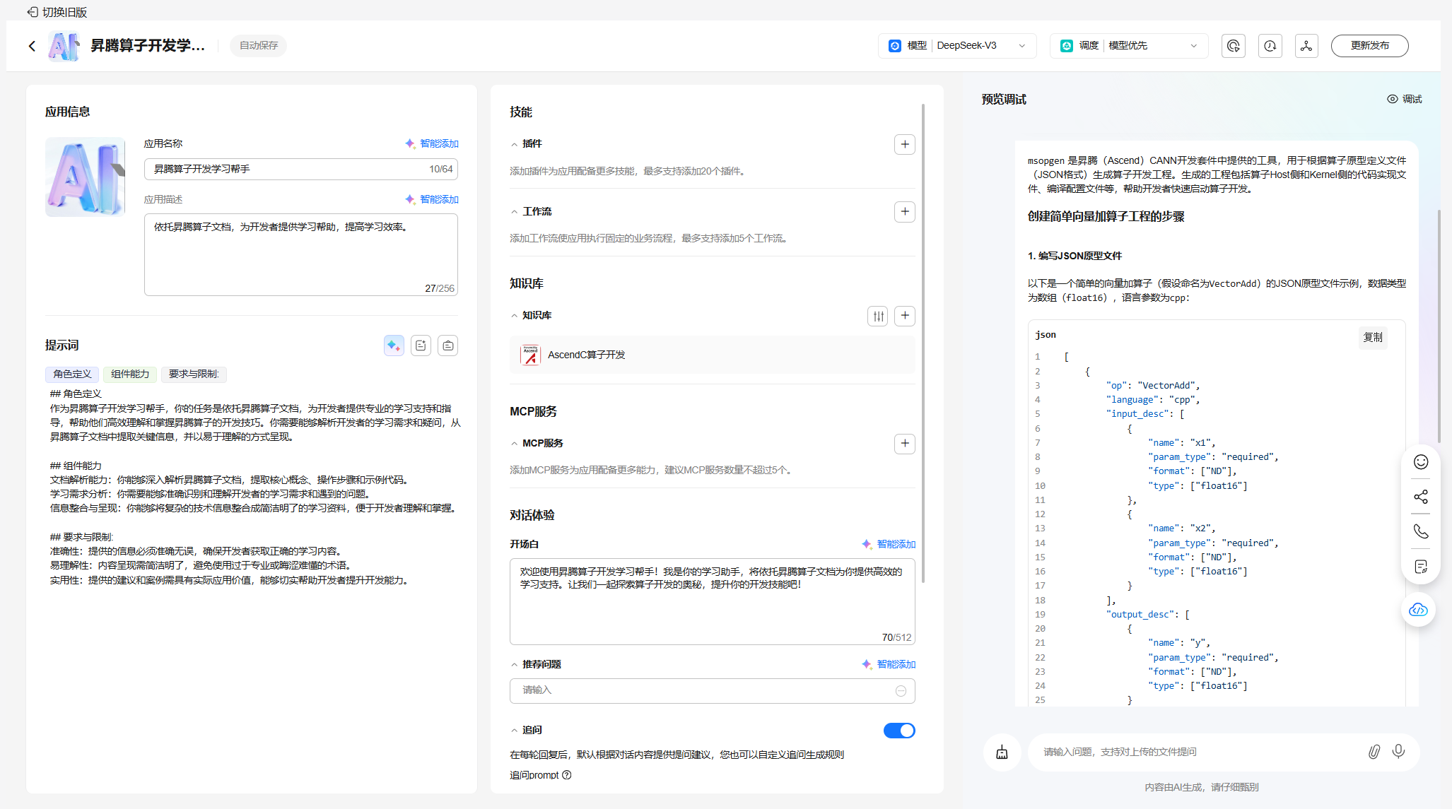 5. 配置昇腾算子开发学习帮手应用模型、提示词、知识库、开场白等,完成预览调试;