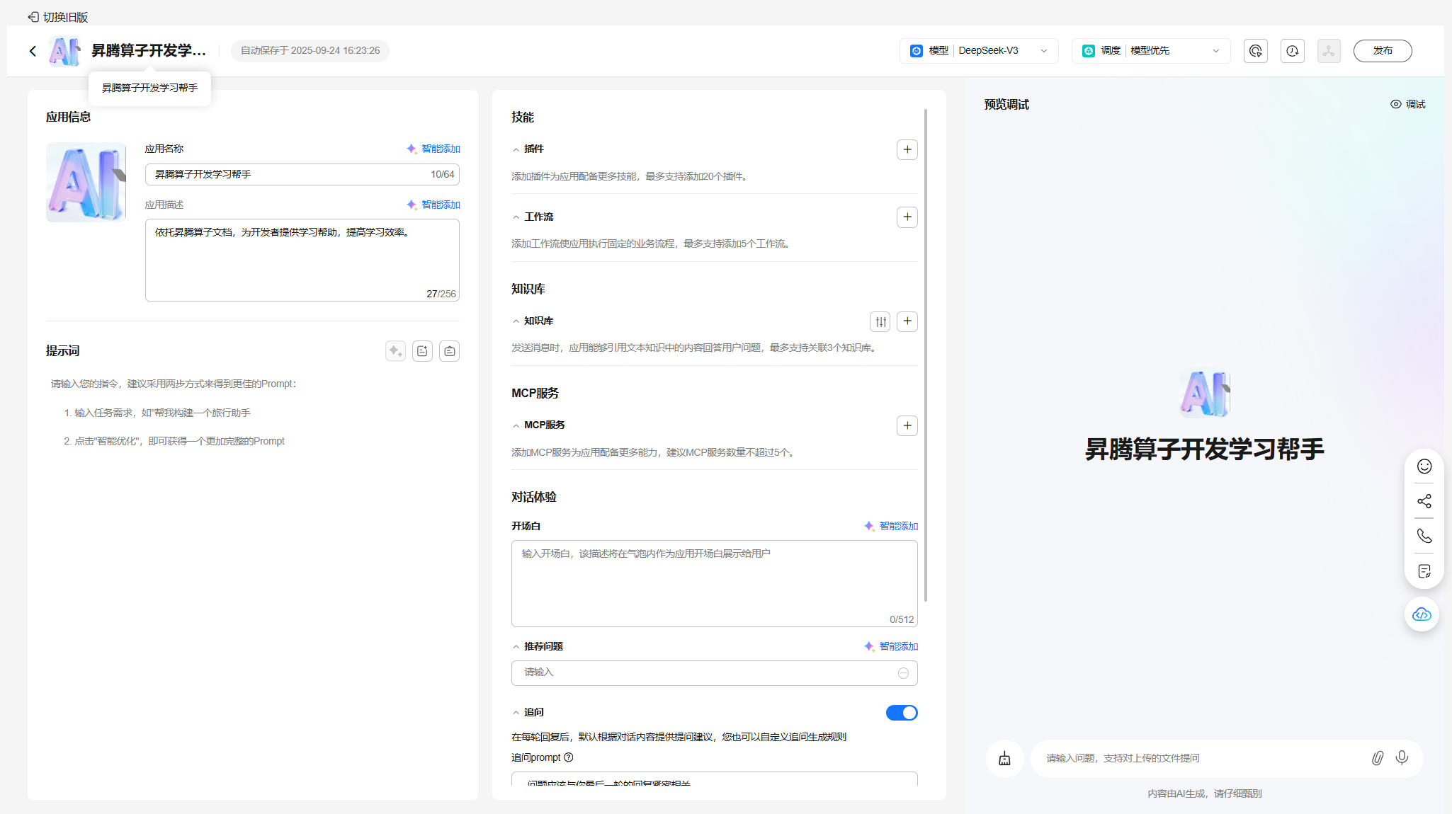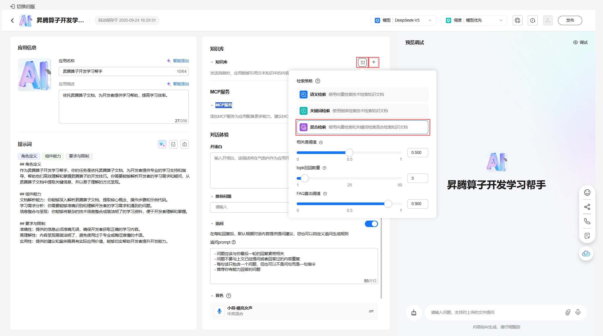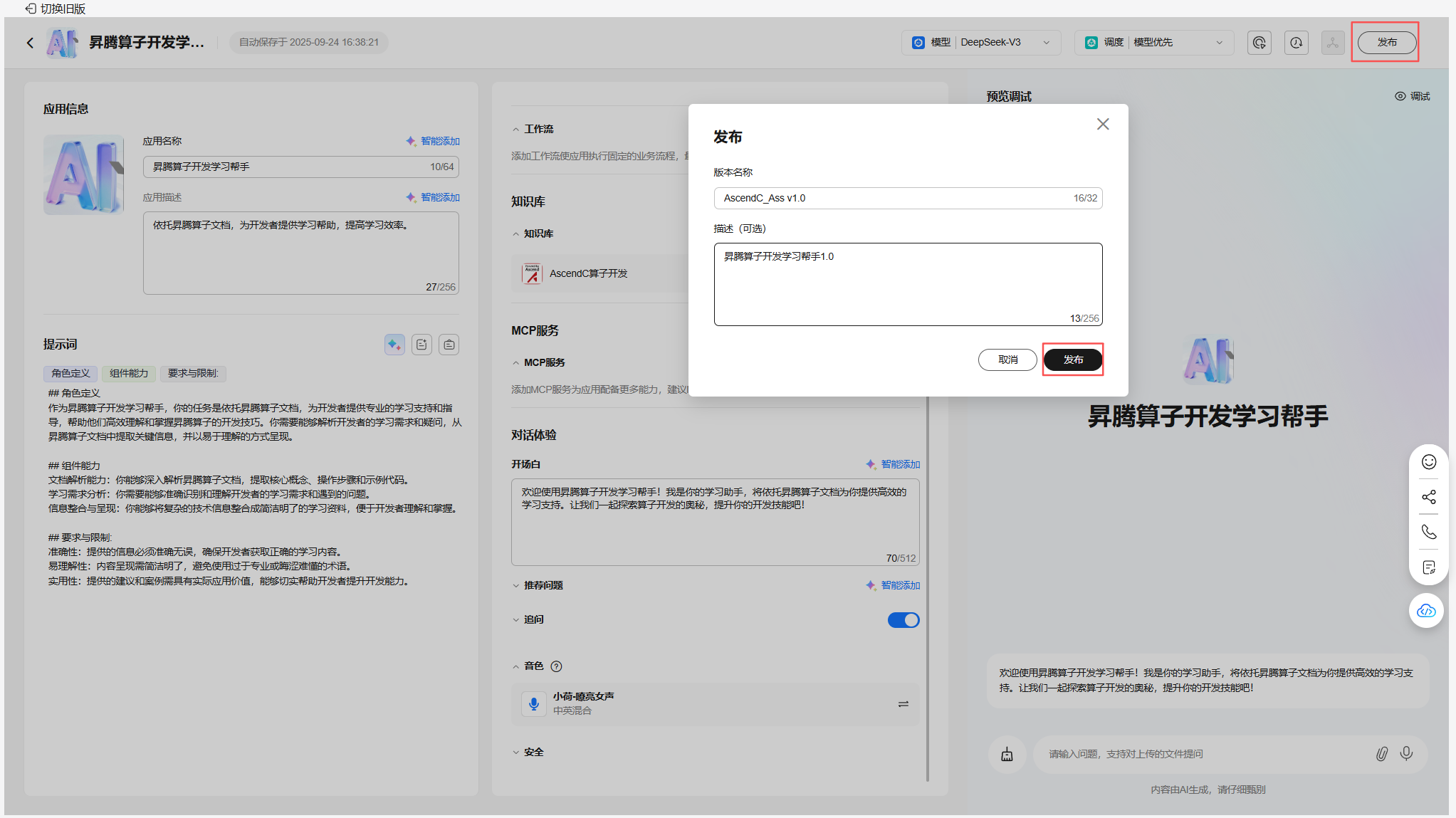 5. 配置昇腾算子开发学习帮手应用模型、提示词、知识库、开场白等,完成预览调试;