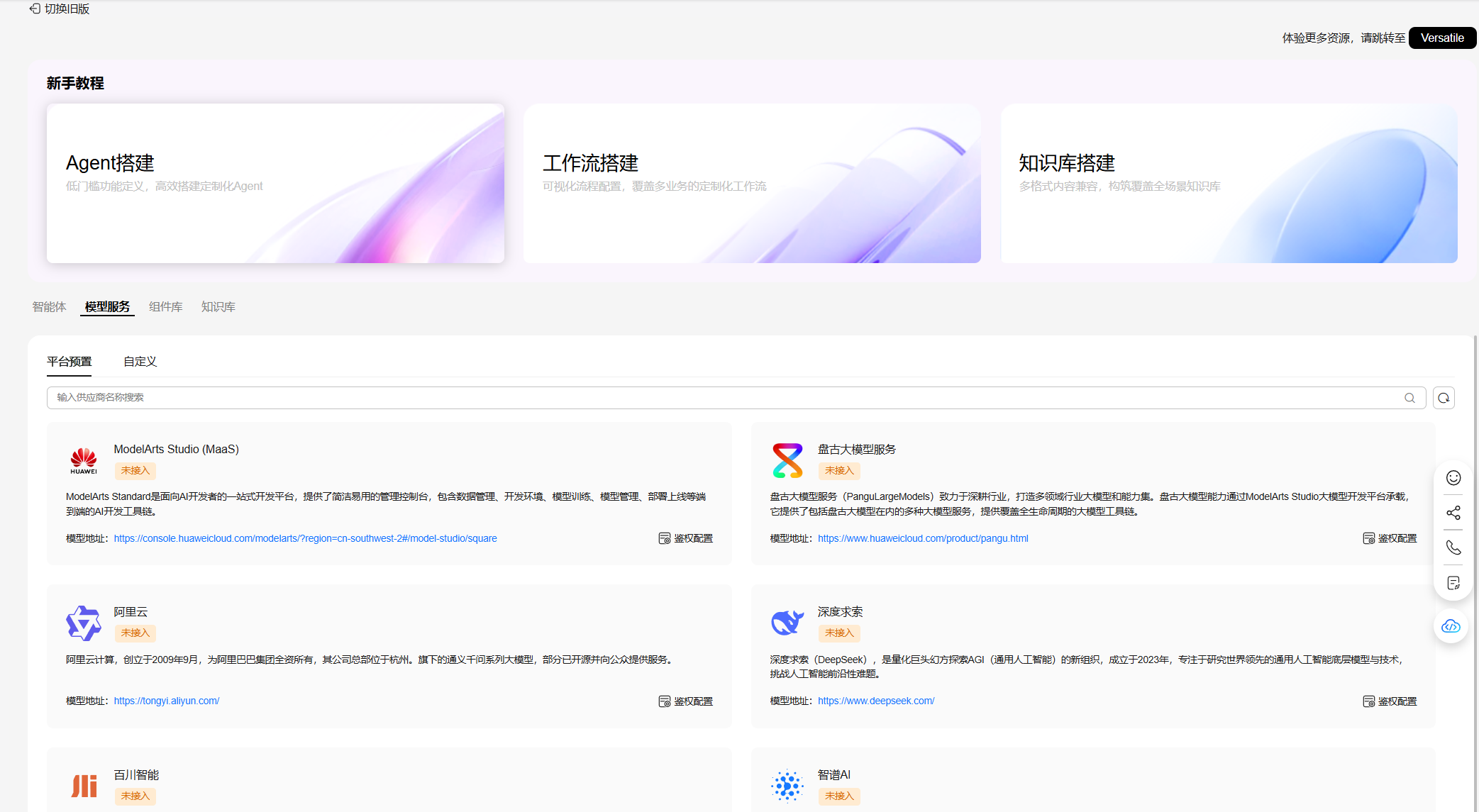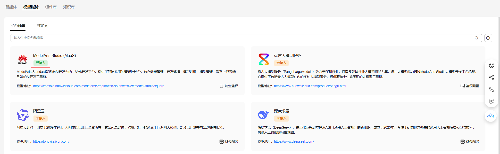 本案例中选用ModelArts Studio(MaaS)模型服务,在Versatile Agent平台选择服务模型 > 平台预置,找到ModelArts Studio(MaaS),点击鉴权配置。