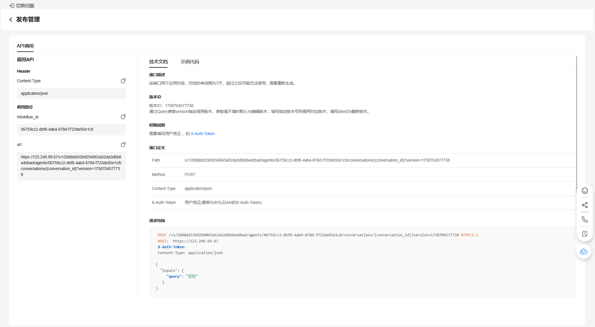 在发布管理界面,可以查看技术文档和示例代码。开发者可进行参考指导将该应用在自己开发的程序中进行调用。