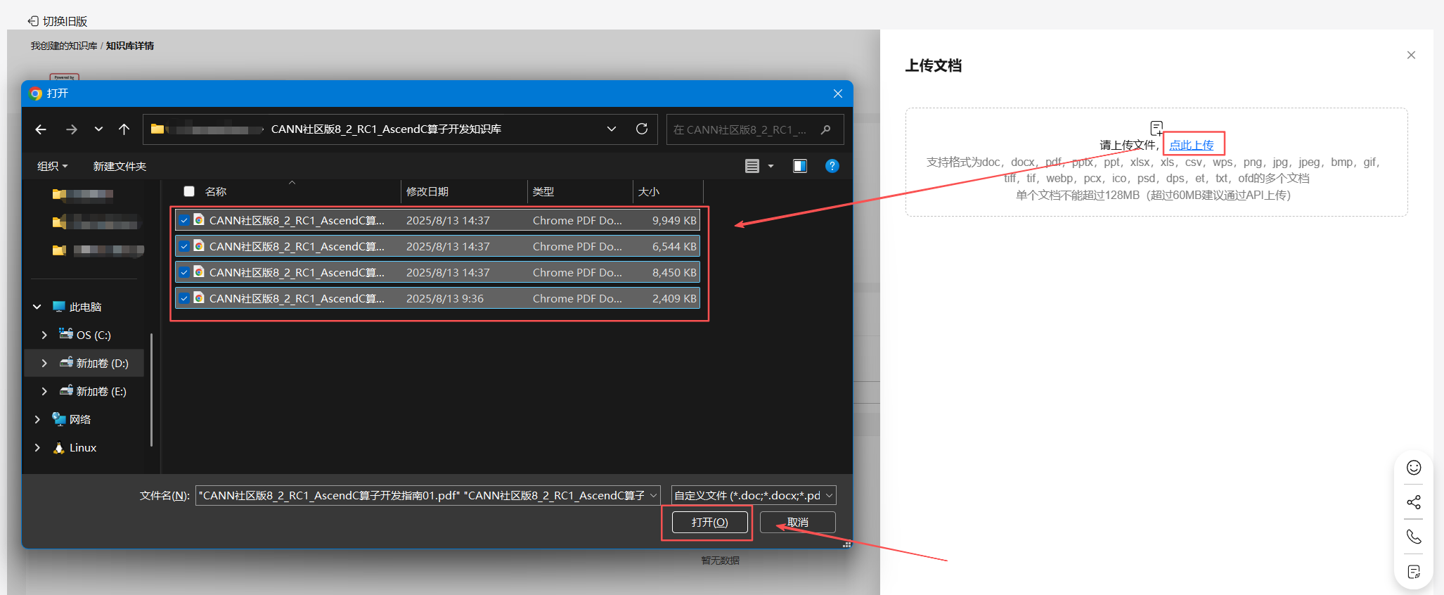 在右侧弹出的上传文档抽屉中点点此上传,选中准备好的PDF文件,点打开。