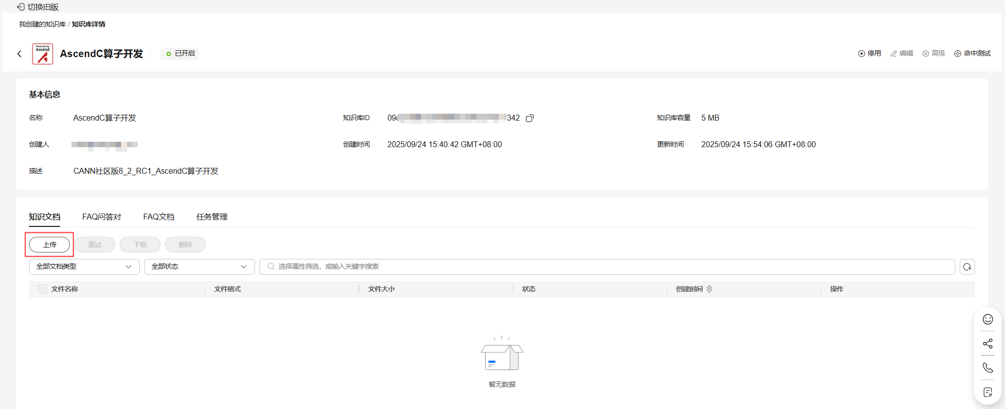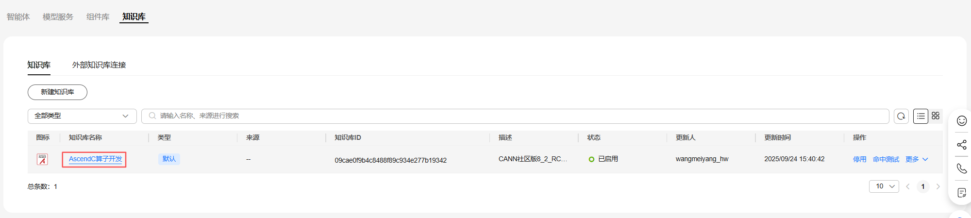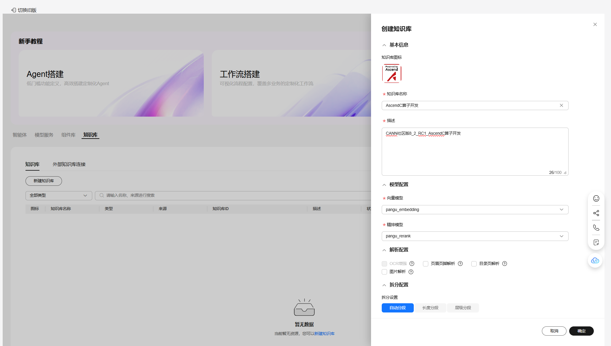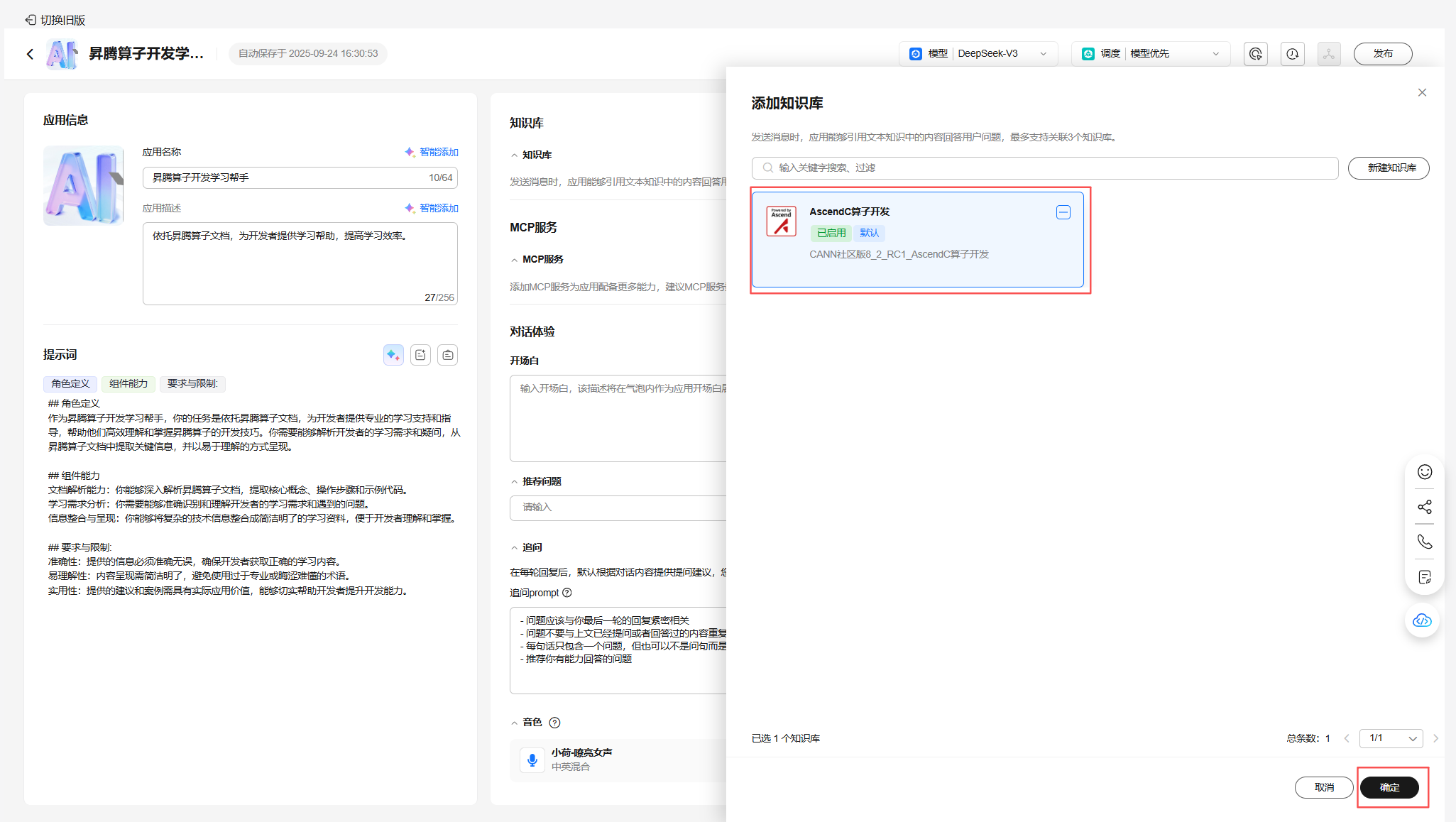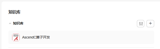 点高级配置右侧的“+”,在右侧弹出的抽屉中选中“二、资源准备与基础环境配置”中的“3. 创建知识库”创建的“AscendC算子开发”知识库,然后点确定。