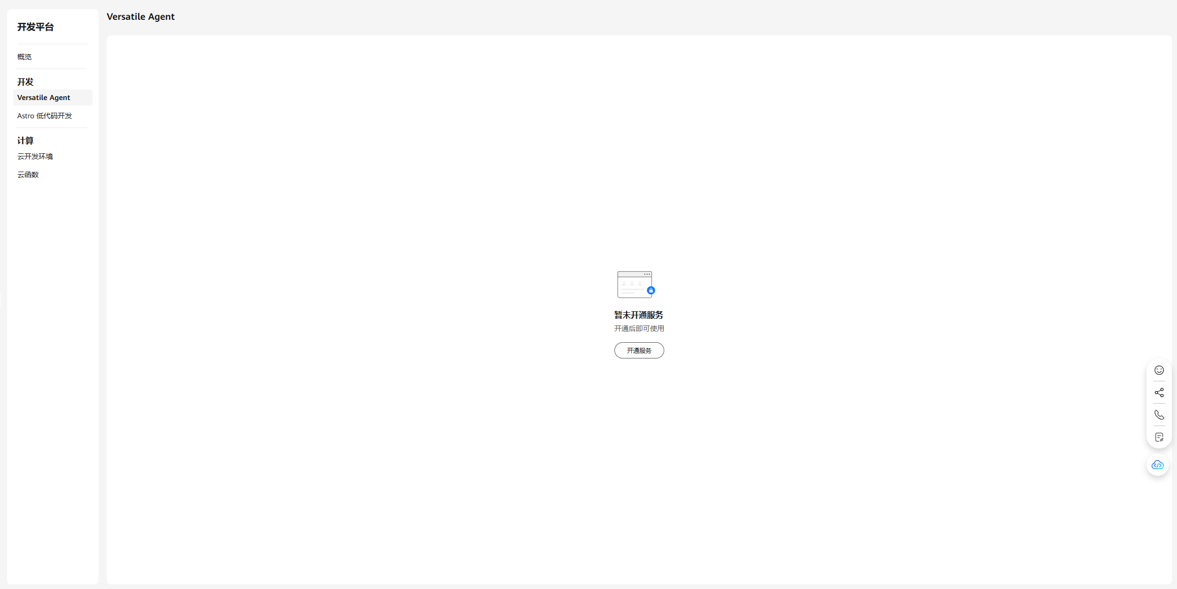签署协议后,开发平台左侧点Versatile Agent,进入华为开发者空间 - Versatile Agent平台。点开通服务,根据系统要求完成开通。