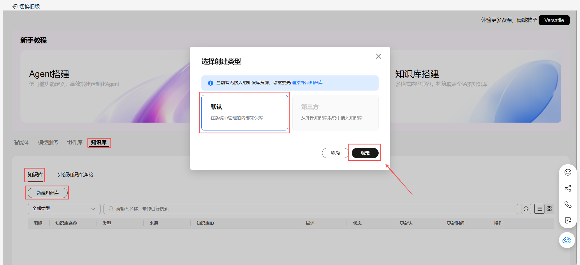 本案例中需要使用自有知识库功能,构建昇腾C算子开发知识库。在Versatile Agent平台选择知识库 > 知识库,点新建知识库,选择默认,然后点确定。