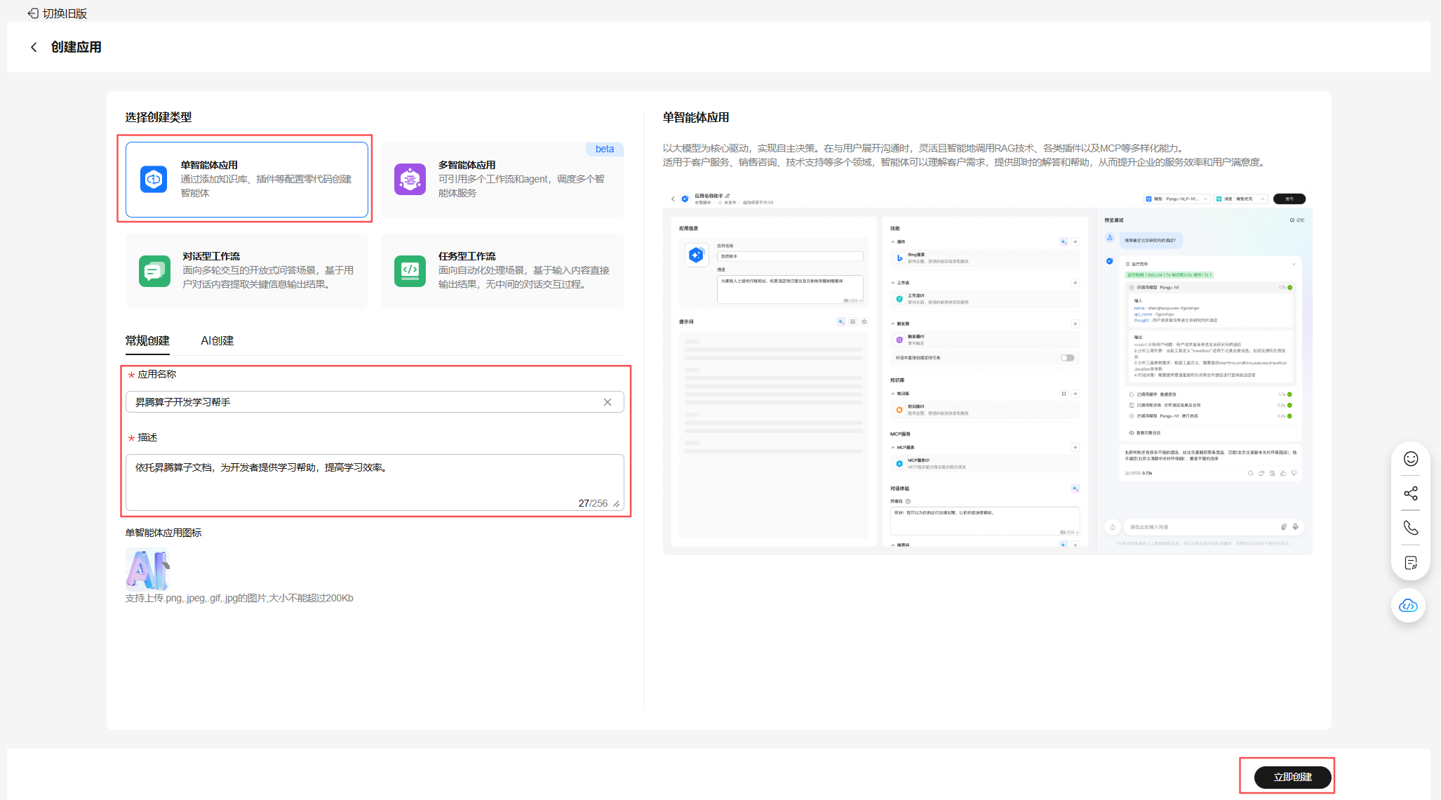 在应用配置界面,创建类型选择默认的单智能体应用,页签选择常规创建,然后配置应用名称及其描述。