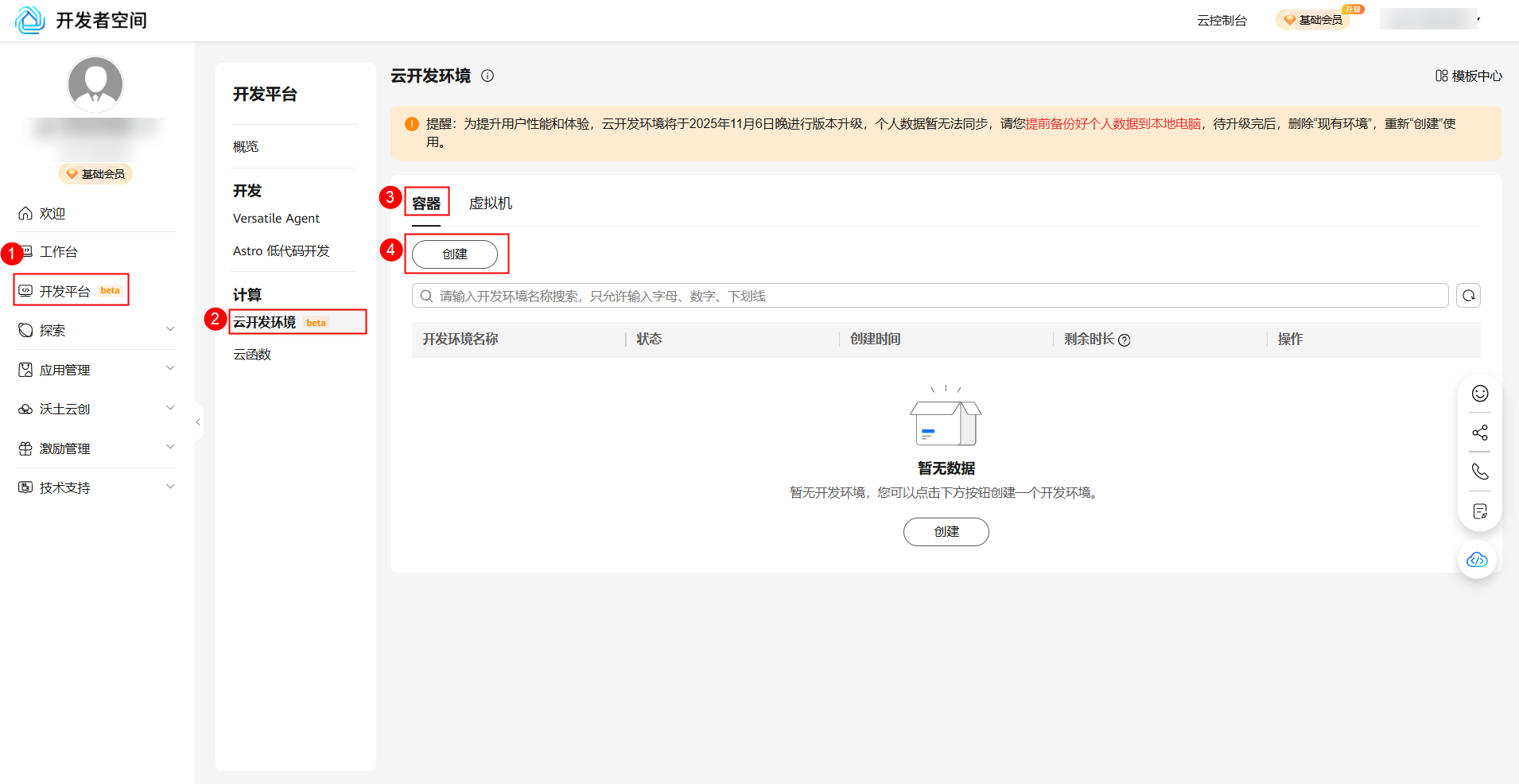 登录华为开发者空间 - 云开发环境平台,右侧页签选择容器,点击创建。