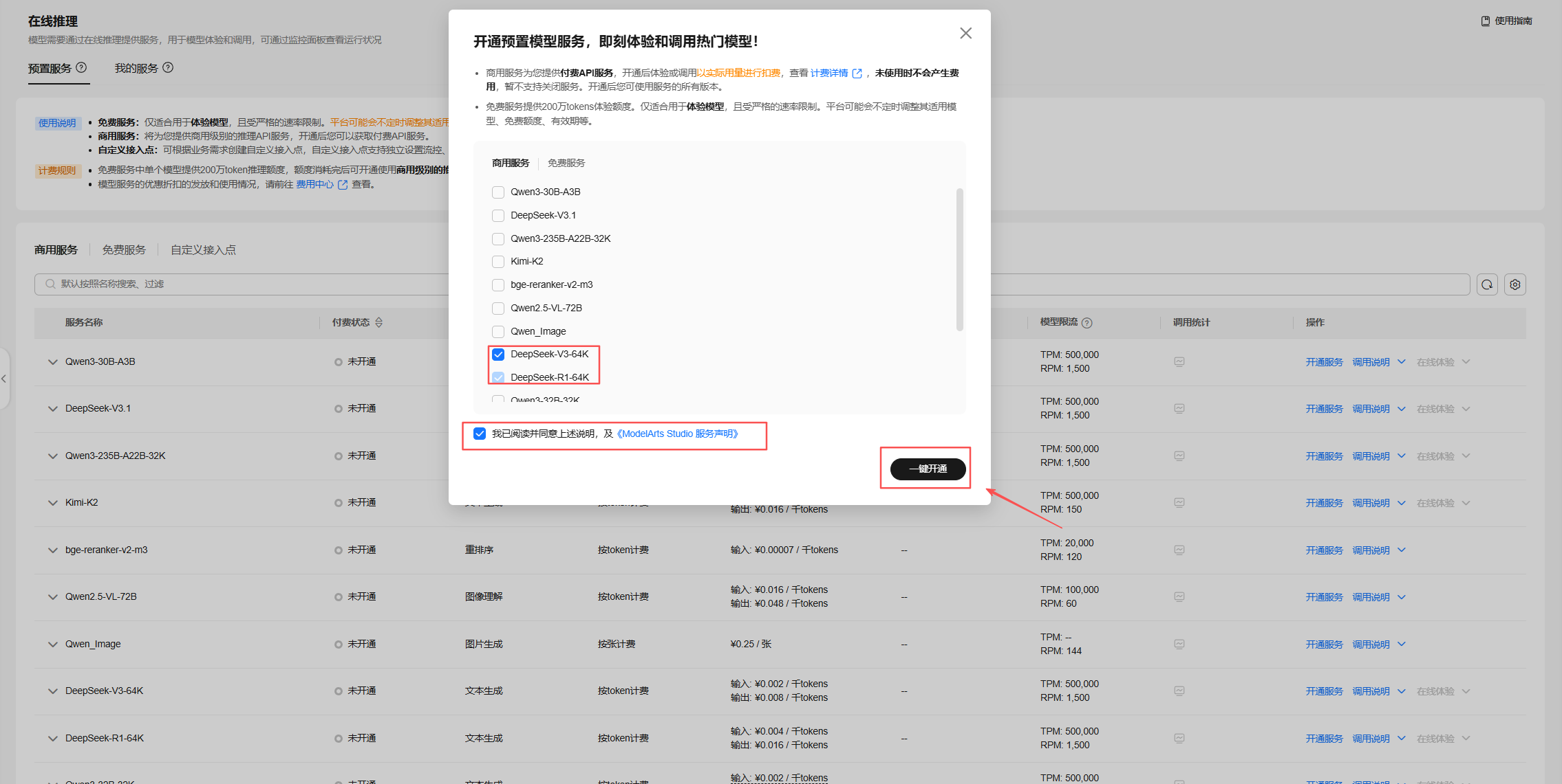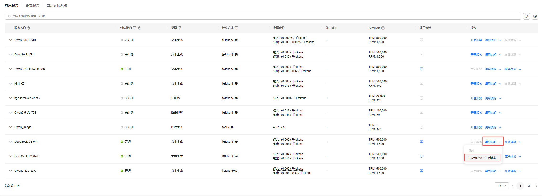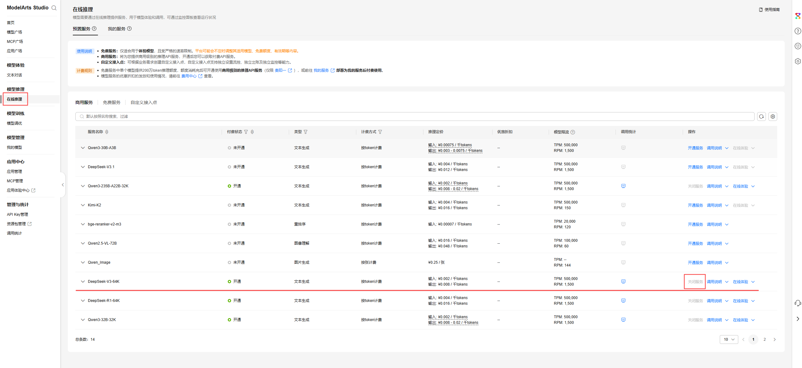 进入MaaS控制台页面,左侧导航栏点模型推理 → 在线推理,右侧预置服务 → 商用服务页签,在下侧的商用服务列表中找到DeepSeek-V3-64K,操作栏点开通服务。