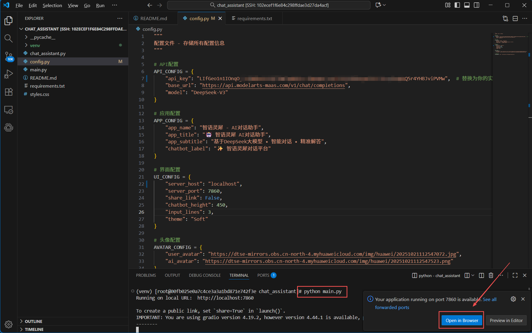 在VS Code终端窗口中运行如下命令,启动智语灵犀 - AI对话助手。