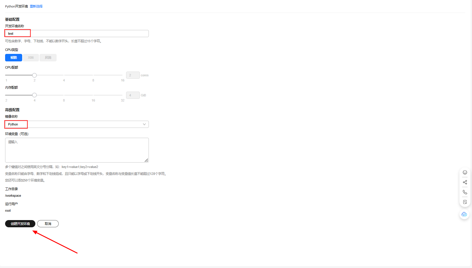 | 开发环境名称 | 必填,可包含数字、字母、下划线,不能以数字开头,长度不超过15个字符。 | test |